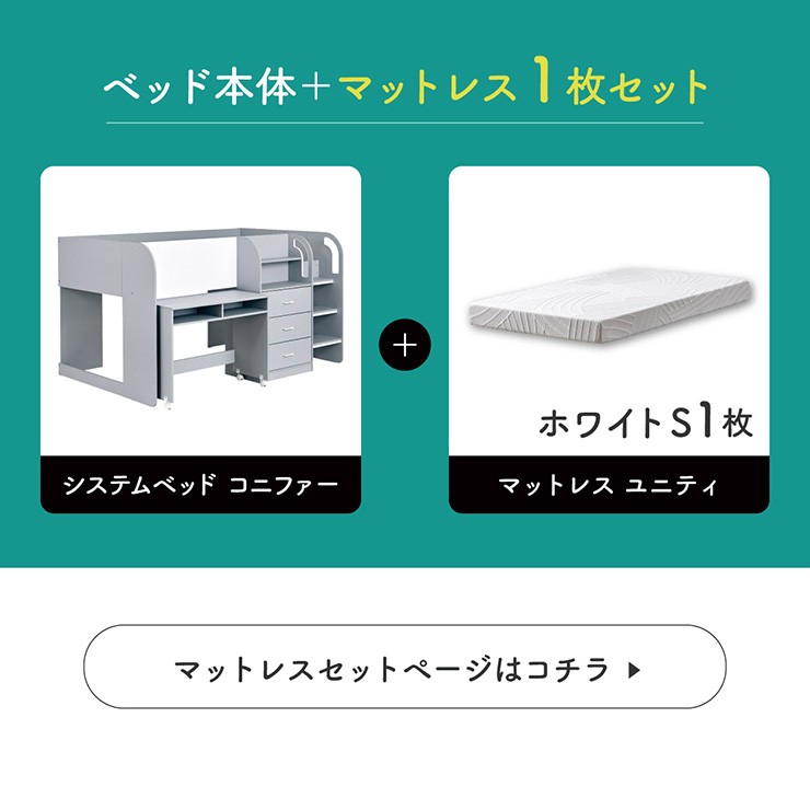 | 長く使える、多機能ベッド システムベッド Conifer(コニファー) 1台でべッド、デスク、収納と必要なものが全て詰まったシステムベッド。遊びにも、勉強にも使える文字が書ける便利なマグネットボード付き。お好みで選べる2colorをご用意しました。 ■お絵描きが楽しめるマグネットボード ホワイトボード用のペンでお絵描きをしたり、磁石を使って自由にくりかえし何度も遊べます。ホワイトボード用のイレーザーで消すことが可能です。 ■出し入れが簡単なキャスター付きデスク サッと引き出せる便利なキャスター付き。天板下には収納スペースもつけました。べッド下に収納可能。天板を一部外して、電源タップ収納や小物収納に使えます。 ■用途に合わせて使える収納スペース 上部はディスプレイを楽しんだり、サッと取り出したいものを置けるオープンスペース。下部は衣類などを収納できる3段の引き出しスペース。 ■寝顔も見れるベッド高112cm べッド高を抑えて圧迫感を軽減。サイドフレームを高めにすることで、寝返りの多いお子さまも安心してお休みいただけます。 ■広めのステップ&手摺りで安心して上り下りできます。 はしごはお子さまが使いやすいよう広めのステップに設計。ステップ下にはしっかりと補強をつけ、大きくくり抜かれた手すりでさらに安心。 ■毎日安心して使える角丸設計 尖った危険な角は丸くすることで安全性をアップ。元気いつばいのお子さまも安心してお使いいただけます。 ※こちらの商品はお客様組み立てとなります。 ※ペンやマグネット等は付属しておりません。 ※組み立て方や若干の個体差によって、表記サイズと完成形のサイズに多少の誤差が生じる場合がございます。予めご了承ください。 | |