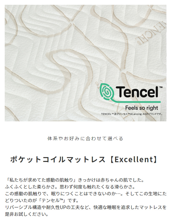 | ふわふわな触り心地と快適な睡眠を追求したマットレス コットンに比べると2倍以上湿気を吸収することができる植物由来の繊維「テンセル™」を使用したエクセレントシリーズ。 高密度コイルのゾーン構造が生み出す『コンプリート』は少し硬めの寝心地です。 リバーシブル素材で年中快適にご使用いただけます。 ●両面仕様 ●圧縮ロール梱包マットレス ●ハンドル付 ●3ゾーン構造 | |