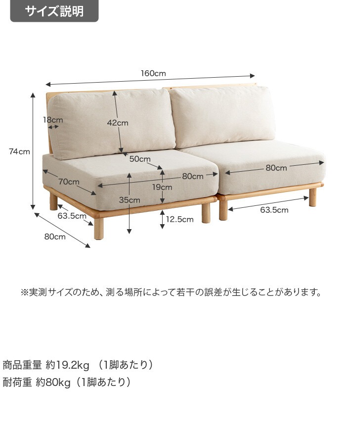 | サイズ | 幅160(80+80cm)x 奥行80 x 高さ74cm(座面高 約35cm/重量:約19.2kg(1台あたり)/耐荷重:約80kg(1台あたり)) 梱包サイズ(2個口):81 x 81 x 40cm |