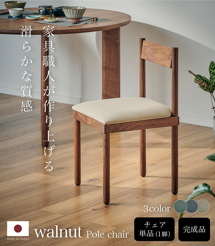 | 「永く使えるシンプルなデザイン」にこだわった国産チェア 「木」本来の美しさを尊重したシンプルなデザインが魅力のチェア。 木の温もり、心地よい手触りをお楽しみいただけます。 ■背中にフィットするよう計算された背もたれ 背もたれの凹みは、何度も削って座るを繰り返し、一番身体にフィットする角度を追求しながら作られています。あらゆる角を滑らかに削ることで、より身体へのあたり心地を柔らかくしました。 ■高級感溢れる天然木ウォールナット材を使用 美しい木肌と深い色合いが魅力のウォールナットは世界三大銘木のひとつ。強度にも優れ、高級家具によく使用されています。 ■一年中快適に使えるファブリック生地 べたつかず、さらっとした手触り ■デスクと合わせてワークチェアとしても◎ ■1脚1脚表情が違う木目 背もたれを斜めの方向に削っているので、木目が広がって見え、より木の風合いをお楽しみいただけます。 ■まるでポールのような丸みのある脚のデザイン ※若干の個体差によって、表記サイズと完成形のサイズに多少の誤差が生じる場合がございます。 ※天然木を使用している為、木の表情や風合いには個体差がございます。予めご了承ください。 ※こちらはチェア単品の販売ページです。テーブルは別売りとなります。 | サイズ | W43 x D43 x H76 x SH45cm |