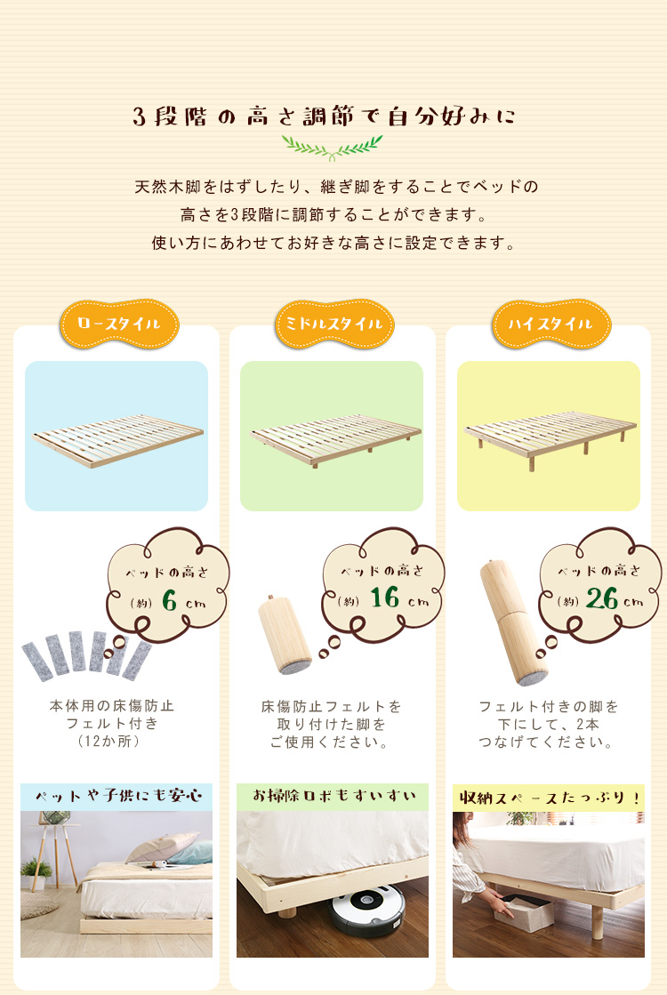 | すのこベッド 3段階高さ調節 Lilitta(リリッタ) 3段階に高さを調節できる脚付きすのこベッド。低ホルムアルデヒド仕様で、F★★★★(フォースター)獲得!お子様にも安心です! ■3高さ調節で自分好みに 天然木脚をはずしたり、継ぎ脚をすることでべッドの高さを3段階に調節することができます。使い方にあわせてお好きな高さに設定できます。 ■LVLすのこで一年中快適 強度が高く、通気性のよいLVLすのこを使用。厚さ12mmの頑丈すのこでしっかり支えてくれます。 ■こだわりの安全性と頑丈設計 静止耐荷重(約)200kgをクリアした頑丈設計!6本の脚で負担が分散されるため、体重をかけても安定した構造です。 ※曲線部や若干の個体差、組立などによリ表記と多少の差異が生じることがごさいます。あらかじめご了承ください。 ※天然木を使用しておりますので、木目・節・色合いに個体差がございます。あらかじめご了承ください。 | |