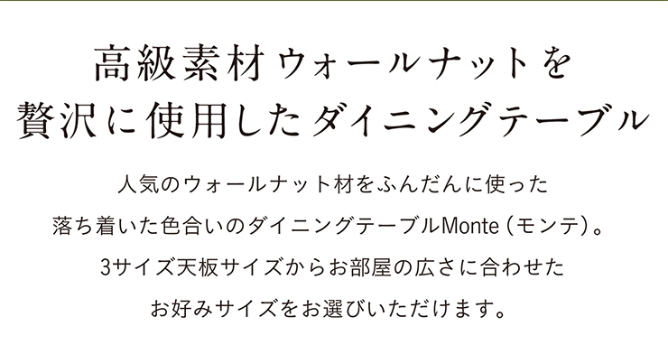| Dining Table Monte(モンテ) 165(Walnut) 高級素材ウォールナットを贅沢に使用したダイニングテーブル。人気のウォールナット材をふんだんに使った落ち着いた色合いのダイニングテーブルMonte(モンテ) ■世界三大銘木のひとつ深みのあるウォールナット材 美しい木肌と深い色合いが魅力。世界三大銘木のひとつで強度にも優れ、高級家具によく使用されています。 ・Top/天板:ウォールナット突板使用 ・Edge/天板縁:ウォールナット無垢材使用 ■無垢材に馴染む「厚突仕様」 天然本を薄くスライスして合板などに貼ったものを突板と言いますが、当商品は厚み約0.6cmの「厚突」仕様。通常の突板に比べ厚く、より無垢材に近い質感に。無垢材の縁取りにより馴染む仕上がりとなっています。 ■Leg 脚は天然木を使用。ブラックに塗装することで、天板のウォールナット材を引き立てます。 ■Finish 天板は汚れに強いウレタン塗装。表面を樹脂膜で保護するため傷や汚れに強く、つるっとした肌ざわりが特徴です。 ■4人+来客にも対応できる幅165cmサイズ 一般的に大人1人が快適に食事をするのに必要なスペースは、幅60cmx奥行き40cmと言われています。当テーブルは幅165cmx80cmで、4人~5人でご使用いただけます。 ■毎日使うモノだから細部までこだわりました 家族が毎日集う場所を心地よく使ってもらいたい。そんな思いを込めて細部までこだわったデザインです。 ・天板厚み2cm/縁部分4cm ・天板裏には反りどめの補強付き ・危険な角は丸く加工しています ・脚裏にはガタつき防止、アジャスター付き ※こちらの商品は脚のみお客様取り付けとなります。 ※組み立て方や若干の個体差によって、表記サイズと完成形のサイズに多少の誤差が生じる場合がございます。予めご了承ください。 ※こちらの商品は、天然木を使用しております。その為、木の表情や風合いには個体差がございます。節など木の風合いを理由とした返品・交換は対象外となりますので、予めご了承ください。 | |