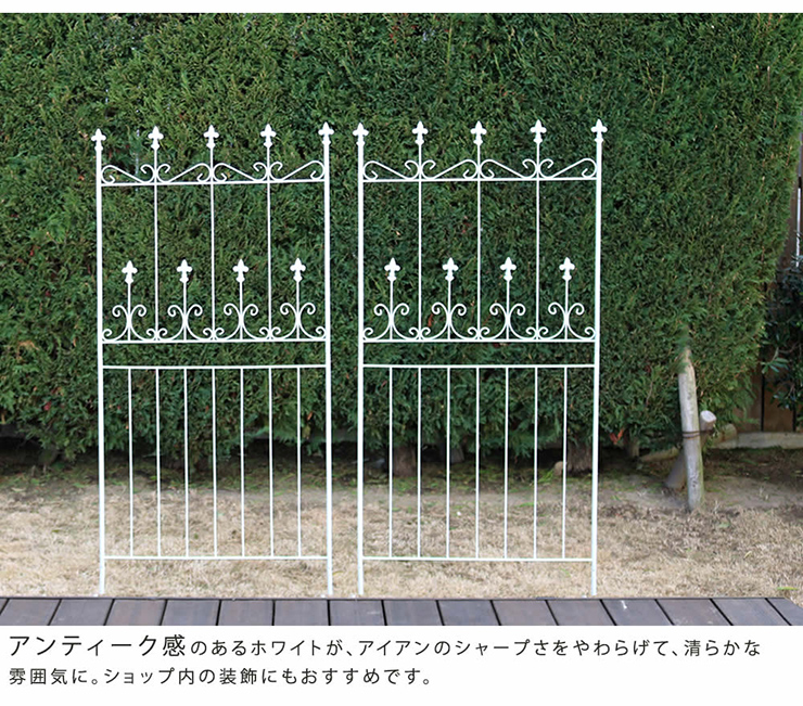 | 均整のとれた優雅な佇まいと、ヨーロッパの古城のような麗しさ。 深い森の中に建つ石造りの古城…そんな雰囲気をただよわせる、繊細で風雅なデザインのアイアンフェンスです。 お庭を華やかにしたり、ハンギングを楽しんだり。 薔薇やクレマチスなどのツル性の植物をからませれば、よくあるメッシュフェンスのグリーンカーテンより、おしゃれで絵になる空間に。 幅71.5cmのワイドサイズなので、お庭をぐるっと囲みたい場合でも、少ない枚数でカバーでき、コストパフォーマンスに優れています。 高さ150cmのロータイプは、隣家との境界線に使えば、圧迫感を感じさせずやんわり目隠し。 毎朝のご挨拶も、軽やかなフェンス越しに笑顔でできそうです。 ※こちらの商品はお客様組立となります。 | |