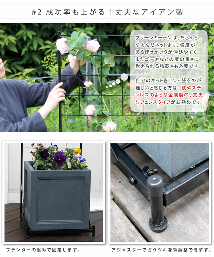 | お庭やベランダが狭くても、ガーデニングは楽しめます。 縦のスペースを有効活用して、プランター やガーデンツールをハンギングしたり、プランターから伸びる薔薇や朝顔、ゴーヤのツルをからませたり。 ハロウィンデコレーションや、クリスマスイルミネーションも飾れますよ。 置いたら即自立! 初心者でも簡単設置OK。 フェンスを組み立てたら、プランターを乗せるだけで設置完了。 狭い空間や土がない場所でも、手軽にガーデニングが始められます。 ※こちらの商品はお客様組立となります。 | |