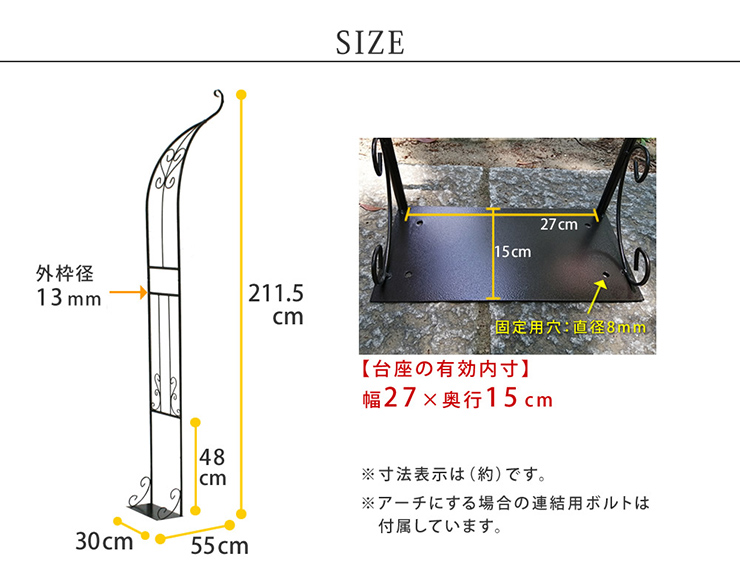 | ベランダでも憧れのバラアーチが叶う♪ 繊細で軽やかなハーフアーチ 「バラアーチに憧れるけど、普通のアーチは大きすぎて…」 そんな声にお応えして、優雅な雰囲気はそのままに、すっきり省スペースのハーフアーチをお作りしました。 設置は簡単、壁に立てかけて、プランターや鉢を重しがわりに乗せるだけ。 台座は設置場所にあわせて、内側・外側どちらに向けてもOKです。 アーチには、フェンスやトレリスとはまた違った、華やかさと物語性があります。 帰宅するたび、室内からお庭を見るたびに、時間を忘れるような癒しのひとときを与えてくれることでしょう。 ※こちらの商品はお客様組立となります。 | |