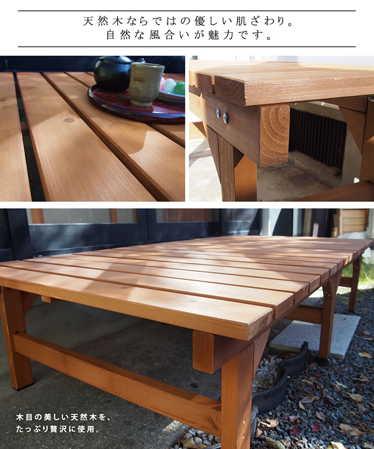| 癒される場所、楽しむ場所、暖まる場所。自由な発想でアウトドアリビングを楽しんで。 天気がいいな、風が気持ちいいなと思った時、お庭にちょっとくつろぐ場所があるといいですよね。 デッキ縁台は、置くだけで、まるで室内の延長のように空間が広がり、癒しのスペースになる優れもの。 一人でのんびりコーヒーを飲んだり、家族や友人と団らんしたり、お庭で遊ぶお子さんやワンちゃんを見守っても。 洗濯かごやガーデン用品のちょい置き場や、洗ったまな板を乾かしたり、干し野菜を作ったりと、何かと便利な家事スペースにもなりますよ。 公園やショッピングモールのようなパブリックスペースや、室内用ベンチとしてもお使いいただけます。 ※こちらの商品はお客様組立となります。 | |