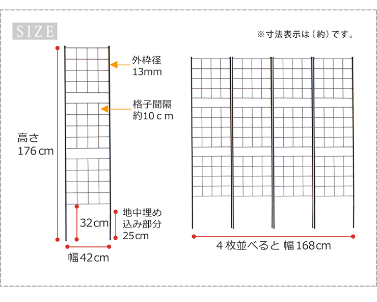 | 地面に挿すだけ!モダンで優雅なワンランク上の庭づくり シンプルで無駄を省き、使いやすさを追求した格子のフェンスは、洗練されたスタイリッシュさも、クラシカルで優美な雰囲気も感じられます。 シンプルモダン、イングリッシュガーデン、フレンチ、ナチュラルetc...、 どんなテイストの空間も引き立てて、場所を問わず活躍します。 見通しのいいアイアンフェンスは、お庭の開放感を維持できるうえに、木製のものより経年劣化が少ないのがポイント。 スリムタイプはトレリスとして使うこともでき、プランターの背面に立てて、薔薇を誘引すると素敵です。 狭いベランダや玄関前でも窮屈にならず、クリスマスイルミネーションや、ハロウインデコレーションなど、家族のイベントを盛り上げます。 ※こちらの商品はお客様組立となります。 | |