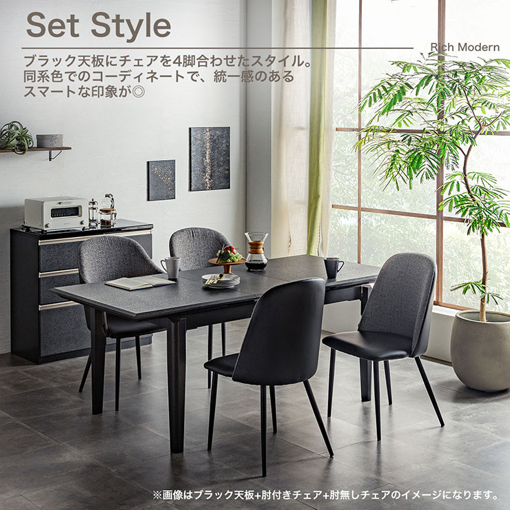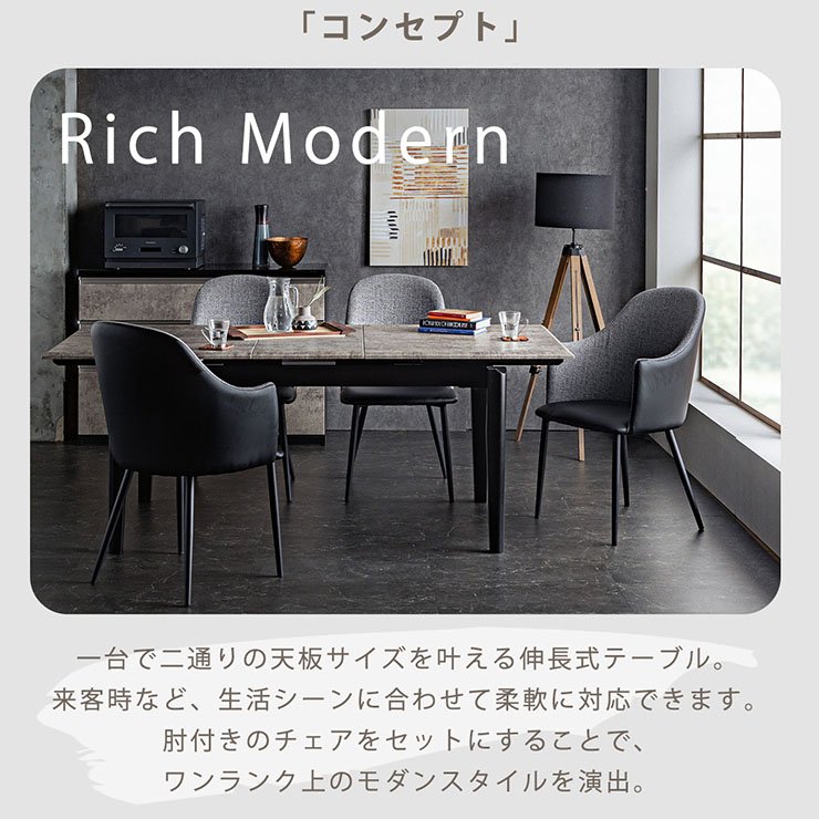 | 伸縮式 ダイニング5点セット 肘付きチェア 一台で二通りの天板サイズに変えられる伸長テーブル。来客時など、生活シーンに合わせて柔軟に対応できます。肘付きのチェアをセットにすることで、ワンランク上のモダンスタイルを演出。 ■ハイグロスシートでお掃除カンタン テーブルの天板表面にはセラミック調のハイグロスシートを採用。傷や汚れに強く、水がこぼれたりした時はサッと一拭き、カンタンキレイです。また、上品なハイグロスシートはお部屋にモダンで高級な雰囲気をプラスしてくれます。 ■Seat ・全体的に丸っこく、柔らかいイメージで、座った時は優しく体にフィットします。 ・座面は通気性に優れたPUレザーを使用。快適な座り心地です。 ・座面の高さは45.5cmです。テーブルとセットした時も違和感なく座れます。 ※若干の個体差により表記サイズと多少の誤差が生じる場合がございます。 | |