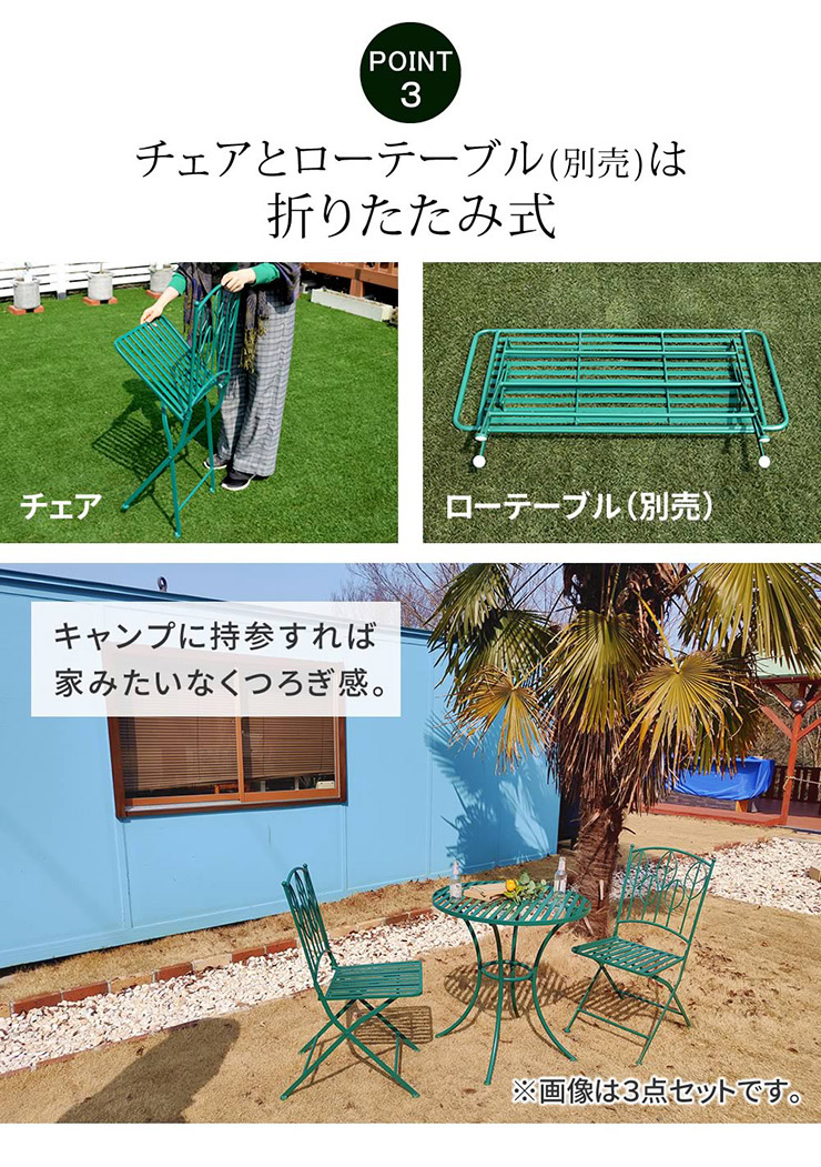 | アイアン製ガーデンチェア2脚セット おしゃれで、組み立て簡単、しかも使わない時期はコンパクトに収納できます 空間も気分も明るくしてくれる、品のいい北欧風ボタニカルデザイン。 流行りのカラフルなクッションも映えますし、飽きずに長く楽しめますよ。 「童話に出てきそうな北欧風ボタニカルリーフ」 アンティーク風が多いアイアン製品の中で、こんなに可愛いモチーフはなかなかありません。 「こだわりのビリジアングリーン」 緑を濃くした「深緑」ではなく、青緑を濃くした「ビリジアン」。ときめきます! 「このグリーンがなかなか見つからなかったのよ~」なんて自慢しちゃいましょ♪ 「持ち運びしやすい折り畳みチェア」 椅子は折りたたみ式ですが、風が強い日も安定してお使い頂けるよう、重みやバランスを工夫しています。 「使いやすいサイズ感」 チェアは、コンパクトで使い勝手のいい幅42.6cm。 お庭の片隅やベランダ、ウッドデッキ、待合室など、ちょっとしたスペースで活躍。 ※こちらの商品はお客様組立となります。 | |