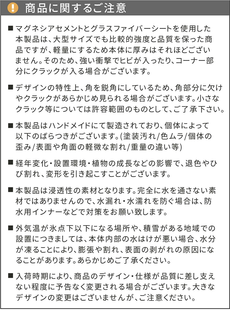 | 「コンクリート打ちっぱなしの質感。現代的でスタイリッシュな空間に。」 コンクリートや石調の色、風合いにこだわった、マグネシアセメント製のプランターです。 気泡などのディテールも再現され、インダストリアルやモダンテイスト好きにはたまらない風合いとなっています。 安定感のある四角い鉢は、オリーブやユーカリのような樹木をコンパクトに仕立てるのに最適。 ラフでありながら、どのカラーも上品なので、寄せ植えもセンスよく仕上がります。 1.軽量・丈夫 マグネシアセメントを基材に、強化用グラスファイバーシートを何層も重ねて成形。 同じ大きさの陶器等のプランターと比べ、強度が高く軽量であることから、移動や植え替えしやすい利点があります。 2.エコロジカルな素材 合成樹脂などを使用せず、地球上に豊富に存在する酸化マグネシウムを主成分とした、環境負荷が低いエコロジカルな素材です。 3.現代的な素材感・テクスチャーを再現 コンクリートの打ちっぱなし風の都会的な素材や、石等の自然素材の見た目に限りなく近づけることができます。 モダンでシンプルな形状は、場所を選ぶことなく、植物と空間をスタイリッシュに演出します。 ※こちらの商品はお客様組立となります。 | |