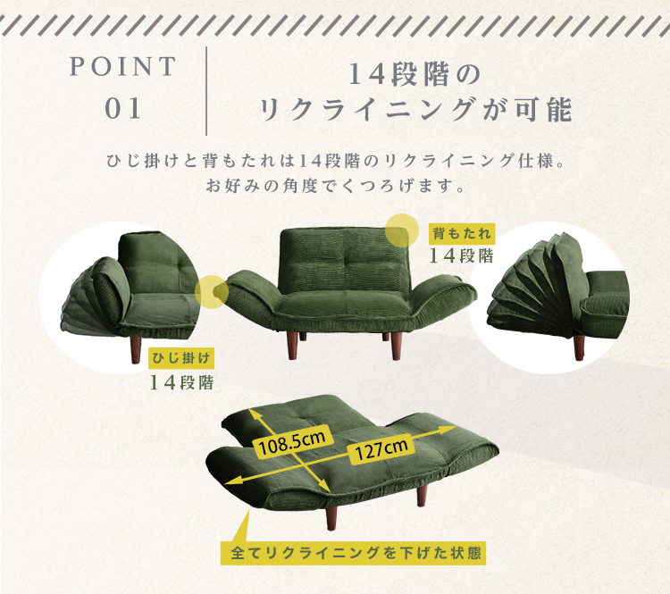 | 日本製 コーデュロイソファ Qooliss(クーリス) 1人掛け 6色対応 コーデュロイ生地で肌触りが気持ちい1人掛けコンパクトソファ! 背もたれ、肘置き部分は14段階リクライニング可能なのでベストな位置に調整できます。 ポケットコイル搭載で耐久性GOOD! ※脚のみ取り付け※カバーは取り外し不可 | |