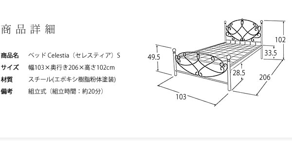 | セレスティアS BSK-906S 2色対応 女の子なら一度は夢見る可愛いデザインのアイアンベッド。 セレスティアのベッドならお子様から大人の方までお姫様気分が味わえます♪ 高級感のある落ち着いたゴールドカラーと、清潔な純白のホワイトの2カラーをご用意。 お好みやお部屋によってお選びいただけます。あなただけの華やかベッドルームをコーディネートしてください♪ ※こちらの商品はお客様組み立てとなります。 ※マットレスは付属しません。 | |