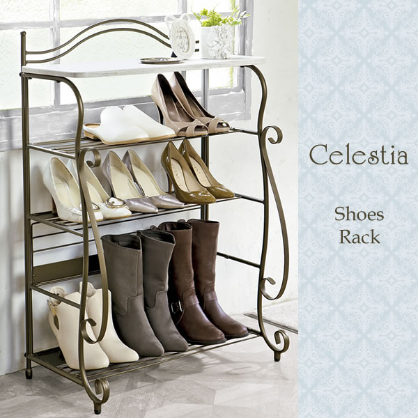 | セレスティアシューズラック SR-620 曲線をあしらった装飾の洗練されたデザイン、心地よさを醸し出すアンティークゴールドが人気のセレスティアシリーズのシューズラック。 シューズラックやスリッパラックなどの玄関収納を有効活用すれば、狭い玄関周りを可愛く魅せることができます。 また、忙しい朝や来客時もつまずいたり探したりすることなく、快適にお過ごしいただけます。 鍵などが置ける天板と跳ね上げ式でブーツも収納できる棚が4段でとっても便利。レディースシューズは最大12足収納できます。 ※こちらの商品はお客様組み立てとなります。 | |