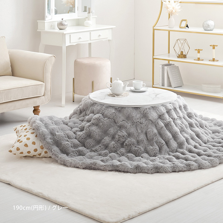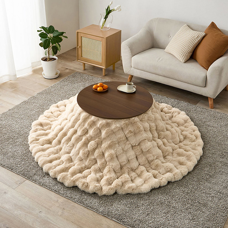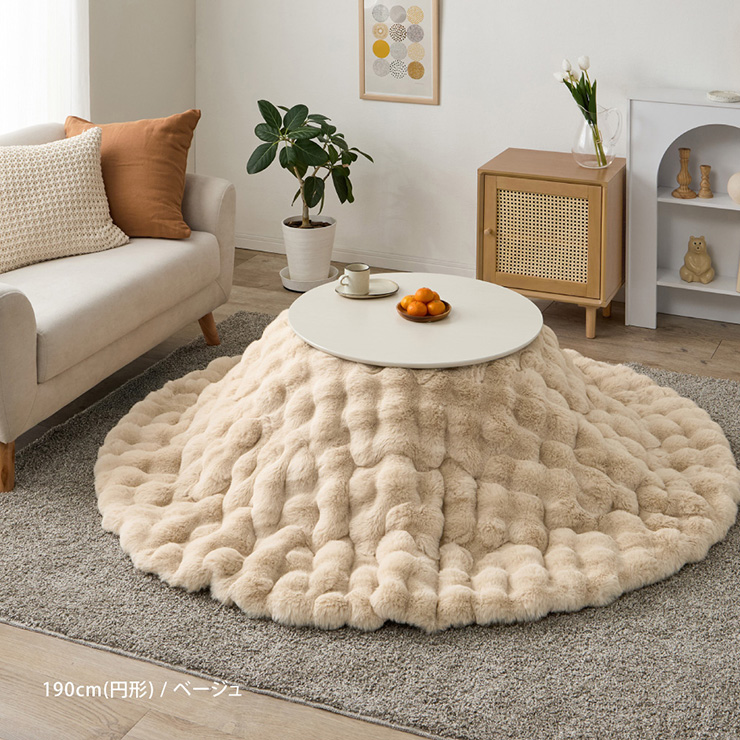 | ラビットファー調こたつ布団 ルナ うさぎの毛並みを表現した「ラビットファー調」は、きめ細やかでうっとりするような、なめらかな肌ざわり。やさしく包み込むようなふわふわタッチに、ぽこぽことした見た目も可愛いおしゃれなこたつ布団です。 ■ぽこぽこ、ふわふわ、ふんわり贅沢な「ラビットファー調」 やさしく包み込むような、とろけるなめらかさのふわふわタッチ。ぽこぽことした、見た目も可愛いおしゃれなこたつ布団です。ウサギの毛並みを表現した「ラビットファー調」で、きめ細かでうっとりするような、なめらかな肌触りです。 ■約3cmのロングパイル仕様 長毛のパイルでふんわり包み込まれるようなやわらかな感触に。また長い毛足が空気を多く含み、温かさを保ちます。 ・繊維が抜けにくい構造で抜け毛が発生しにくくなっています。 ・贅沢な高密度パイルでボリューム感があり、なめらかな触り心地 ・中綿もしっかり詰め込み、薄掛け布団でも程よい厚み ■洗濯機で洗える 汚れても洗濯機で丸洗いできるからいつも清潔に使えます。 ・安心の低ホルム ・静電気防止加工で冬の乾燥シーズンも安心 ■裏地も心地よい「フランネル」 柔らかく滑らかな起毛生地を使用。保温・保湿性にも優れ、寒い身体を温めてくれます。 ※お洗濯の際は、必ず洗濯ネットをご使用ください。 ※家庭用ドラム式洗濯機の場合、故障の恐れがあございますのでご使用はお控えいただき、コインランドリーをご利用ください。 ※テーブルの高さや、厚掛け・薄掛けで誤差がありますが、基本的にこたつ布団はこたつ本体のサイズより100~130cm程度大きいものが適正といわれています。 ※若干の個体差によって、サイズに多少の誤差が生じる場合がございます。 ※画面上のカラーはご使用ブラウザやモニターの設定により、実物とは若干異なる場合がございます。 | |