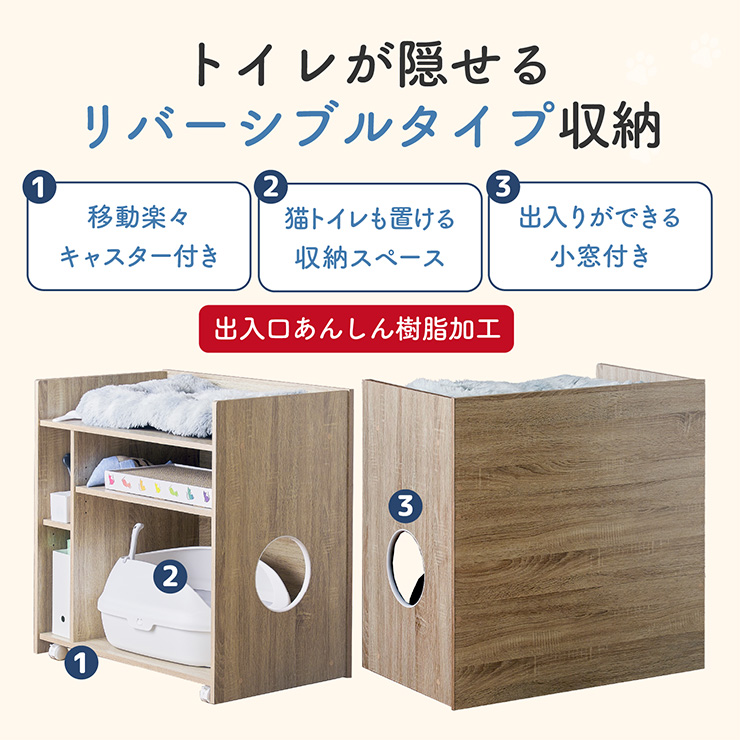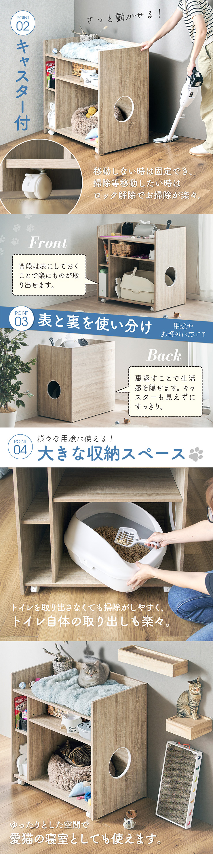 | トイレタリーキャビネット 隠せる収納 madder(マダー) ■トイレが隠せるリバーシブルタイプ収納 ■見た目をすっきりしつつ、生活に便利性を ■トイレ時の砂の飛び散りを最小限に。お掃除も簡単 ■さっと動かせるキャスター付き ■用途やお好みに応じて表と裏を使い分けられる ■様々な用途に使える大きな収納スペース ■小さなお子様がいるご家庭でも安心 ■安心・安全な出入り穴 ■他の猫用品も仕舞える大容量収納 ■多種の猫トイレが入る幅広スペース ■可動棚収納 ■天板は大容量のフリースペース ※こちらの商品はお客様組み立てとなります。 ※組み立て方や若干の個体差によって、表記サイズと完成形のサイズに多少の誤差が生じる場合がございます。予めご了承ください。 ※猫用トイレは付属しておりません。 | |