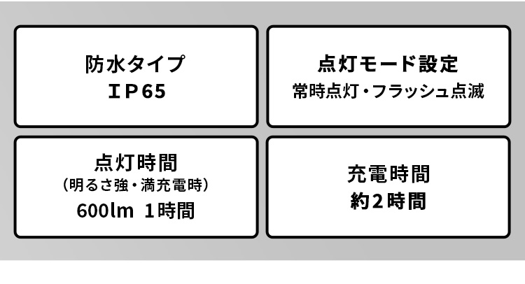 | 充電式 スーパーフラッシュライト 日本メーカーが手掛けた確かな性能で、コンパクトながら投光器のような強力な光を放つことが可能です。 ■3通りの取り付け方 カラビナフックでバッグに吊り下げたり、クリップでポケットやベルトに引っ掛けることが出来ます。強力マグネットで金属に貼る付けることも可能です。 ■4種類に切り替えられる点灯モード スイッチを押すと順にモードが変わります。 ■電池交換が不要のUSB充電式 ・充電時間2時間 ・充電用USBケーブル付属(※USB充電器は付属していません。) ■持ち運びに便利なコンパクトサイズ バッグに入れてもかさ張らない小型サイズで、軽量だから携帯するのに便利です。 ※本機はIP65の防塵・防水仕様のため水のかかる場所も使用できますが水中には沈めないでください。 ※周囲の温度が10℃~40℃の範囲内で充電を行ってください。 ※直射日光の当たる場所や炎天下の車内などでは保管・充電しないでください。火災・故障の原因になります。 ※長期間使用しない場合は、充電池が劣化します。3ヶ月に一度を目安に充放電を行ってください。 ※曲線部や若干の個体差により、表記と多少の差異が生じることがございます。予めご了承ください。 | |