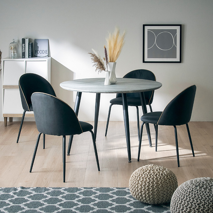 | ダイニング5点セット Andante(アンダンテ) 円形タイプ 2色対応 マットな質感の石目調が魅力、高級感があるのに落ち着くダイニングへ 石目調天板とファブリック座面の異素材感がお部屋のアクセントに。 高級感があるのにリラックスできる、モダンすぎないダイニングセットです。 ■2〜4人で使いやすい110cmの天板 ■素材 ・水や汚れに強い「強化シート」 ・張り地には、ファブリック生地を使用 ・丈夫で耐久性のあるアイアン脚 ■丸テーブルのメリットについて ・どこに椅子を配置してもOK、人数を選ばない柔軟性も◎ ・みんなの視線が交差するから、顔を見ながら団欒を楽しめる ※こちらの商品はお客様組み立てとなります。 ※組み立て方や若干の個体差によって、表記サイズと完成形のサイズに多少の誤差が生じる場合がございます。予めご了承ください ※チェアの背の厚みには、製造プロセス上±5mmのわずかな誤差が生じる場合がございます。予めご了承ください ※熱いものを置くときには、直接置かないように注意してください。 ※こちらは、テーブルx1・チェアx4の5点セットでの販売となります。必ずセット内容をご確認ください。 | |