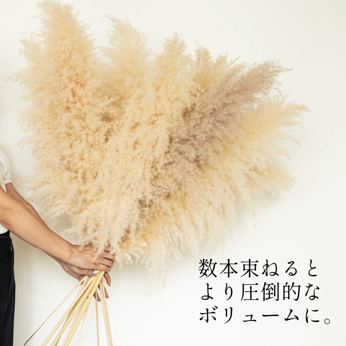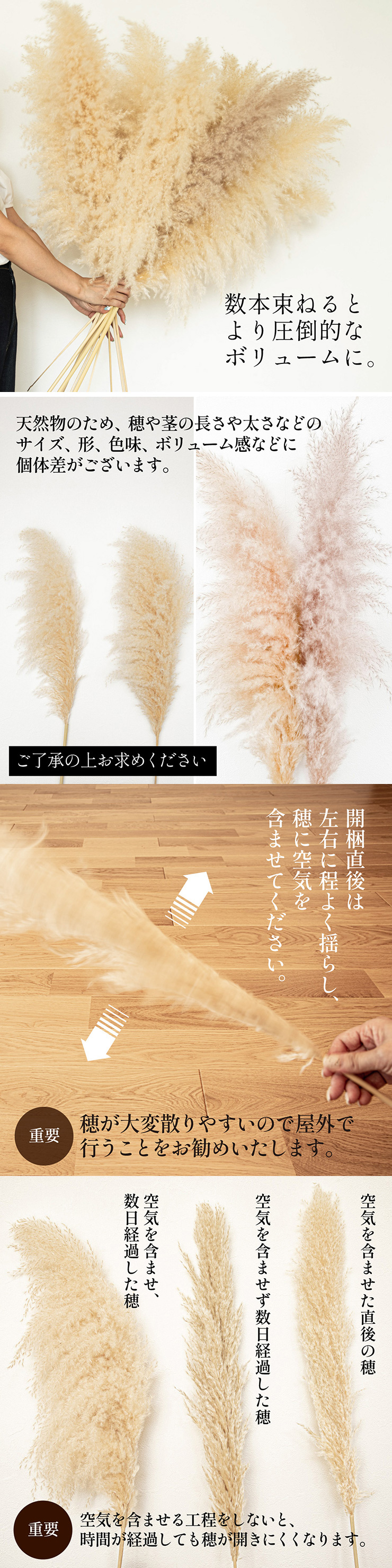 | Pampas Grass(パンパスグラス) 天然Lサイズ 12本セット ふわふわ感がたまらない ふわふわとした質感と、自然を生かした色味が特徴のパンパスグラス。 北欧インテリアや韓国インテリアでは欠かせない存在になっています。 取り入れやすいアイテムで、置くだけでお部屋をお洒落に見せてくれるのでコーディネート初心者さんにもおすすめ! お部屋に温かみをプラスし、居心地のいい空間に変えてくれます。 生活感がでがちなダイニング周りも、パンパスグラスを置くことでお洒落な空間を作ることができます。 無機質になりがちな御手洗も、パンパスグラスの華やかさで一気に雰囲気を変えることができます。 洗面室にパンパスグラスを取り入れることで、日常の空間にさりげないエレガンスをプラスできます。 お客様から見られる頻度が多い玄関は、特にオシャレにしておきたいもの。 ※天然物のため、穂や茎の長さや太さなどのサイズ、形、色味、ボリューム感などに個体差がございます。ご了承の上お求めください。 | |