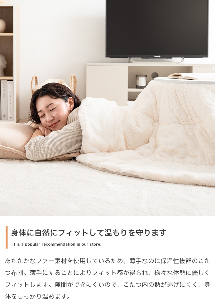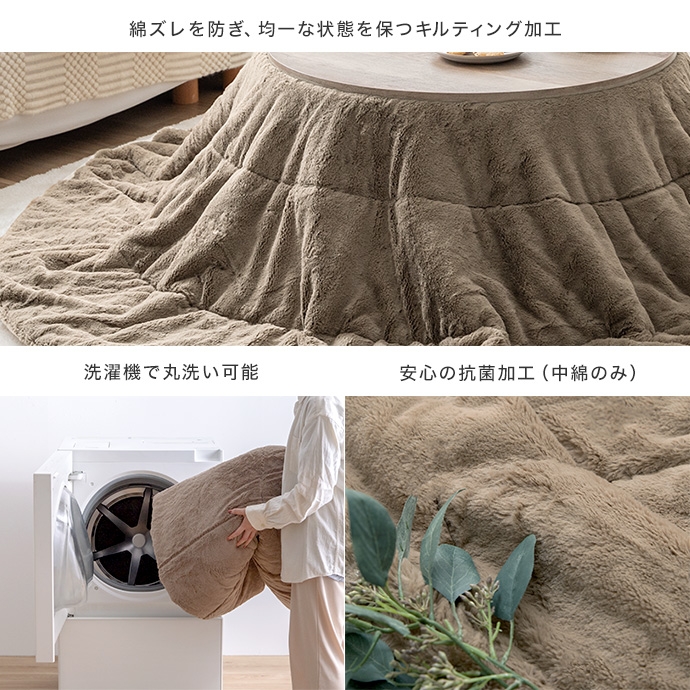 | 薄掛け リバーシブルファーこたつ布団 Chubby(チャビー) 薄掛けで、省スペースで置けるリバーシブルタイプ。表地には程よくボリューム感のあるフェイクラビットファー、裏地には保湿性と柔軟性に優れたフランネル生地を使用しています。 ■気分で変えて楽しめるリバーシブルタイプ 生地にはフェイクラビットファーxフランネルを使用。表裏でカラーも違うので、印象を変えてお使いいただけます。 フェイクラビットファー:ふんわり柔らかく、サラッとした触り心地。 フランネル:保湿性と柔軟性に優れた生地を使用。 ■オフシーズンもコンパクトに収納可能 畳んでかさばらず、付属のバッグに入れて収納しておけるので、省スペース且つ清潔に保管しておくことができます。 ■スローケットとしても活用できます。 ■綿ズレを防ぎ、均一な状態を保つキルティング加工 ■洗濯機で丸洗い可能 ■安心の抗菌加工(中綿のみ) ※こたつ台、ラグは別売りです。 | |