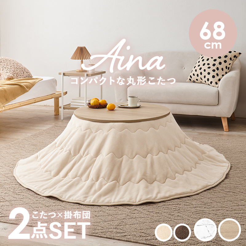 | 円形 こたつ&うす掛け布団 2点セット アイナ68ユイ ワンルームに置きやすいコンパクトな丸形天板のおしゃれなこたつです。軽くてかさばらないマイクロファイバー生地の掛け布団セット ■ワンルームにも置きやすい直径68cm コンパクトサイズの丸形こたつテーブル。子供部屋や一人暮らしの部屋にもぴったり。温まりながら、デスクワークや読書にも最適です。 ■オールシーズン使えるデザイン こたつに見えないシンプルなデザインなので、春夏もローテーブルとして使うことができます。天板すべり止め付き ■保温性抜群の「マイクロファイバー生地」 通常の繊維と比べて非常に細かいマイクロファイバー生地を使用。肌触りがよく、保温性や吸水性にも優れています。洗濯は手洗いOK ■軽くてかさばらない厚み ほどよい厚みですっきりと使えます。収納用の袋つきなので、保管も安心。 ■U字型石英管ヒーター300W ■中間スイッチ・コードフック付き ※この商品はお客様組立となります。 ※収納袋のカラーは変更になる場合があります。 | |