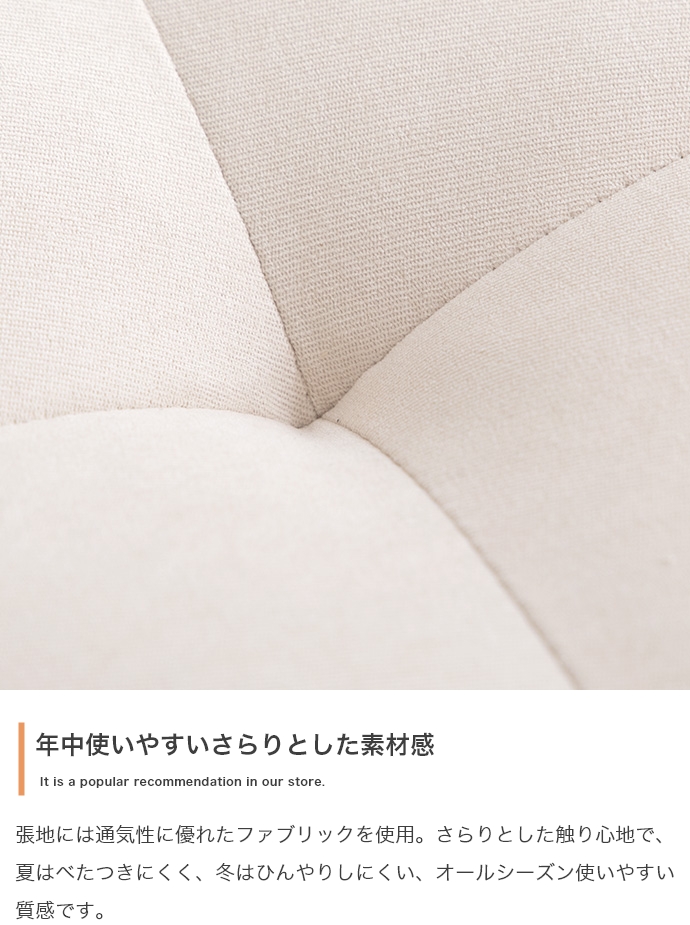 | 材質・素材 | 張地:ポリエステル 本体:Sバネ・不織布・ウェービングベルト・ウレタン・再生綿・アジャスター・樹脂ゴム脚 |