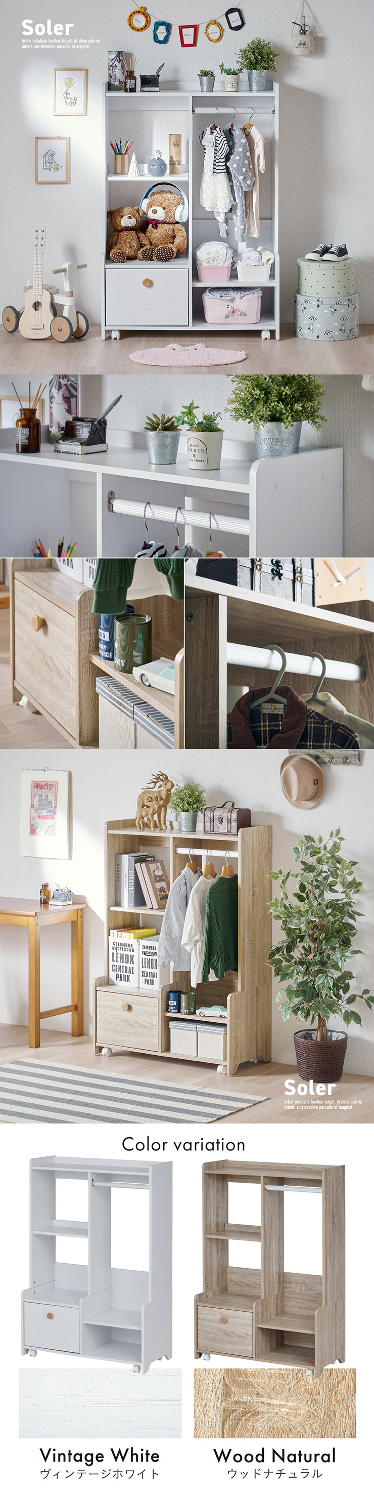| 【ランドセルラック】シリーズで揃えたいキッズラック Soler(ソレール) 成長に合わせて使えるデザインのSolerシリーズ ■ハンガーポールの高さを変えられます お子さまが自分で洋服をかけられる高さを上下の2段階で選べます。 ■充実した収納スペース ランドセルや教科書、小物までまとめて収納できる、使いやすく充実したスペースを備えています。 ■高さ調節ができる可動棚 収納するものに合わせた高さにすることでスペースを無駄なくお使いいただけます。 ■好きな場所にランドセルを収納できる ランドセルをどこにでも収納できる設計で、整理整頓が簡単。収納場所に困らない便利なラックです。 ■移動はキャスター付きなのでラクラク 4つのキャスターの内2つはストッパー付きなので固定もできます。 ■キャスターなしでもOK 固定の位置で動かないようにしたい方は、組み立ての際にキャスターを取り付けず、そのままご使用いただけます。 ※こちらの商品はお客様組み立てとなります。 ※組み立て方や若干の個体差によって、表記サイズと完成形のサイズに多少の誤差が生じる場合がございます。予めご了承ください。 | |