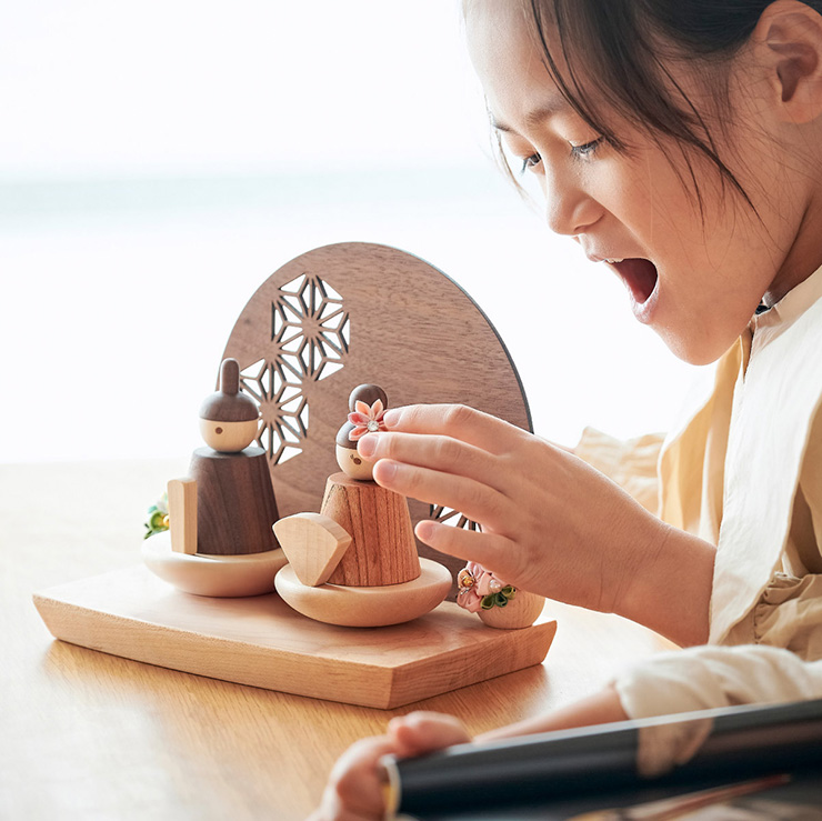 | ゆらゆら揺れる木製ひな人形 扇台座 木の温もりがやさしい手のひらサイズの木製ひな人形3点セット 木の温もりがやさしい、手のひらサイズの木製ひな人形 女の子の誕生を祝い、健やかな成長を祈るひな祭り。 自然の木の色や質感をそのままに、日本の職人さんがひとつひとつ丁寧につくりました。 細かなパーツもすべて木製 つみきのように可愛らしいあたたかみのある一品 重ねて揺れてちょこんと並べて ■色味の異なる3種類の無垢材の組み合わせ 家具高級材として知られるウォールナットとメープル、木目が美しいケヤキの3種類を使用しています。 ■木にも環境にも優しい塗料を使っています。 赤ちゃんのおもちゃにも使える安心・安全な塗料を使用しています。 ■着脱パーツで簡単に組み立てられます。 穴に差し込むだけなので着脱が簡単。保管時もコンパクトになるため場所を取りません。 ※小さい部品があります。誤飲・窒息の危険がありますので、小さなお子様には絶対に与えないでください。 ※本商品はお子様向けの玩具ではありません。ご使用及び管理は必ず大人の方がお願いします。 ※天然無垢素材の質感を生かした商材です。木目の色、節の有無など、一つひとつの違いがあります。 ※また、湿気や乾燥などで膨張や収縮、反りなどの変化が発生する場合があります。天然素材の特徴をご理解いただいた上でご購入ください。 ※一つひとつ手作りのため、表記サイズと完成形のサイズに多少の誤差が生じる場合がございます。予めご了承ください。 ※カビ、または木の変形、変色が早まる恐れがあるため、使用時、保管時ともに、高温多湿、食車日光を避けてご愛用ください。 ※先端がとがっている部品がありますので注意しご使用ください。 ※本商品は食べ物ではありません。口の中には絶対に入れないでください。 ※小さなお子様の手が届かない場所にお飾りください。 ※平らな安定した場所にお飾りください。 ※ギフトラッピング&熨斗には対応していませんのでご了承ください。 | |