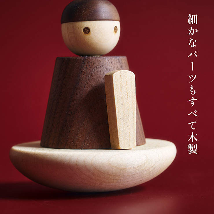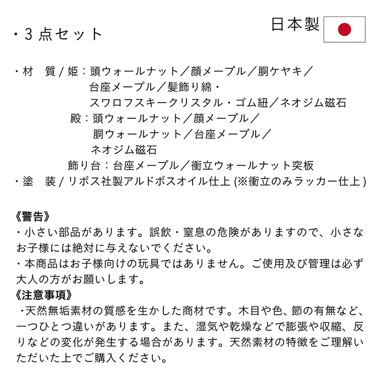 | 材質・素材 | 姫:ウォールナット(頭)・メープル(顔)・ケヤキ(胴)・メープル(台座)・綿/スワロフスキークリスタル/ゴム紐(髪飾り)・ネオジム磁石 殿:ウォールナット(頭)・メープル(顔)・ウォールナット(胴)・メープル(台座)・ネオジム磁石 飾り台:メープル(台座)・ウォールナット突板(衝立) |