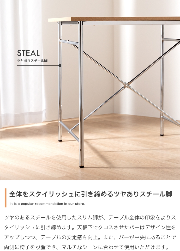 | 【幅75cm】Joel ダイニングテーブル 異素材ミックスの組み合わせが美しいダイニングテーブル『Joel(ジョエル)』。 お部屋に置くだけで、上質で洗練された空間を演出します。 使いやすいサイズ感の天板とお手入れのしやすい加工により、長く快適にご使用可能。 クロスバーによる横揺れ防止でしっかりとした安定感があり、食事だけでなく、ワークスペースや趣味の時間にも大活躍。 圧迫感の少ないデザインのため、一人暮らしの方やワンルームなどにもおすすめです。 ■上質な雰囲気で食卓を囲むダイニングテーブル 単色×木目×スチールの異素材ミックスが美しいダイニングテーブル「Joel(ジョエル)」。 使いやすいサイズ感で、食事だけでなく、ワークスペースや趣味の時間にも大活躍。 天板はメラミン加工、脚部にはクロムメッキ加工を施しており、傷や汚れに強くお手入れも簡単です。 ■単色×木目×スチールが空間を彩り引き立たせる 単色・木目・ツヤのあるスチールが織りなす絶妙なバランスが、美しい空間を演出。 スタイリッシュで調和のとれたデザインは、お部屋に自然に溶け込みながら、心地よい雰囲気を生み出します。 ■インテリアに合わせて選べる2カラー展開 さまざまなテイストのお部屋に馴染む2カラー展開。 上品で明るい印象のホワイトは、ホテルライクや韓国インテリアに。 高級感漂う落ち着いたブラックは、モダンやインダストリアル系のお部屋におすすめのカラーです。 ■コーディネートの幅を広げる木目のテーブルエッジ シャープな印象のある単色天板×スチール脚のデザインに、木目のエッジを追加。 直線的なデザインの中に自然なテイストを馴染ませることで、柔らかさをプラスしお部屋のコーディネートの幅を広げます。 ■全体をスタイリッシュに引き締めるツヤありスチール脚 ツヤのあるスチールを使用したスリム脚が、テーブル全体の印象をよりスタイリッシュに引き締めます。 天板下でクロスさせたバーはデザイン性をアップしつつ、テーブルの安定感は向上。 また、バーが中央にあることで両側に椅子を設置でき、マルチなシーンに合わせて使用いただけます。 ■広々天板でいつもの食卓にピッタリ 天板は幅75cm×奥行75cmとしっかり広く使えるサイズ感。 2人で食卓を囲むことができ、作業をしたりするときにも便利な広さです。 ■シーンを選ばずマルチに活躍 食事でのご使用だけでなく、ティータイムや趣味の時間、ご友人とのリラックスタイムにも大活躍、 生活の中のあらゆるシーンで快適にお使いいただけます。 ■作業用デスクとしても PCや資料を置くのにも十分なスペースを確保できるため、作業用デスクとしてもおすすめ。 広々天板で効率よく作業に取り組んでいただけます。 ■汚れにくく傷に強いお手入れ簡単な天板 天板には、水や傷に強いメラミン貼りを施しました。 汚れが染み込みにくく、ちょっとした衝撃では傷付きにくいため、普段から気兼ねなくお使いいただけます。 また、お手入れもサッと拭くだけで簡単にでき便利です。 ■錆びにくく頑丈なクロムメッキ加工 スチール脚には錆びにくく頑丈になるクロムメッキ加工を施しました。 傷にも強く、汚れてもふき取るだけでお手入れらくらく。 艶やかな光沢が長く続くため、末長くお使いいただくことが可能です。 ※商品の仕様やデザインは、品質に問題がない程度に予告なく変更させていただく場合がございます。 ※商品の仕様やデザインは随時改善をしており、入荷のタイミングによってはデザインが変更されている場合がございます。 ※何度も同じ商品をご注文しているお客様はくれぐれもご注意下さい。 ※部品、生産国、脚部の形状、縫製、カバー類の色や形、サイズなどに少々誤差が発生する場合がございます。 ※複数の倉庫より商品を出荷させていただきますので、商品が同じ日時で届かない場合がございます。予めご了承を宜しくお願い致します。 | |