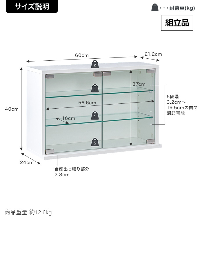 | 耐荷重 | 天板:約2kg ガラス棚板(各):約1kg 底板:約5kg |
