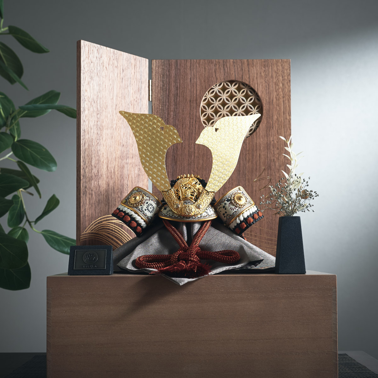 | 雄山作 日月之極 兜収納飾り 天照と月読選べる2type モダンなデザインを取り入れたコンパクトな五月人形 端午の節句を彩る逸品 ■"太陽と月"がモチーフの兜 ・天照:太陽をテーマにしたデザインの兜。精緻な金具細工で大地に降り注ぐ光を表現しています。屏風には「組子」を採用。「七宝柄」づかいで、節句がより華やかに。 ・月読:月をテーマにしたデザインの兜。兜鉢には、ウサギたちが月の周りを跳ねながら餅つきをする様子があしらわれています。屏風は丸窓のような趣があるデザインで、月夜の静寂さを表現しました。 ■Pedestal[台座] 節句が終わったら収納箱に。実用性xデザイン性を兼ね備えた台座。焼き桐の箱に塗装をかけることで、重厚感と高級感を引き立たせています。兜一式をすっきり収納できるような設計にしました。 ■Flower[花] 現代のお部屋にぴったりのお花をご用意しました。華やかながらも主張しすぎないデザインが、ほどよいアクセントになります。 《本作品に関するお願い》 ・掲載画像の兜飾りは撮影用見本です。お届けする商品とは細かい点で差異が生じる場合があります。 ・職人による手作り品のため、兜飾りごとに個体差があります。 ・柄や色の濃淡などは個体ごとに異なります。 ・金属の特性上、一部変色などが起きる場合がありますが、品質上問題はございません。 ・飾り台や箱、屏風など、特に木材を使用した部品については、天然素材の性質上、木目や色味の違い、節の有無など、個体差が発生します。 ・その他、塗装のムラや少量の接着剤のはみ出し、木製部品の小さな欠けなど、手作りでの製作工程上、避けられない箇所があります。 ・商品画像は可能な限り現物に近い色味で撮影しておりますが、お使いのモニター、また、飾られる場所の光源などによっては、実際の色味と違って見える場合がございます。 ・飾り付ける際に必ず手袋をご使用ください。錆や変色などの予防にもなります。 ・本品の上には絶対に乗らないでください。 ・本品または本品の部品は装飾品です。他の目的に使用しないで下さい。 ・天然無垢素材の質感を生かした商材です。木目や色、節の有無など、一つひとつ違いがあります。また、湿気や乾燥などで膨張や収縮、反りなどの変化が発生する場合があります。天然素材の特徴をご理解いただいた上でご購入ください。 ・カビ、または木の変形、変色が早まる恐れがあるため、使用時、保管時ともに高温多湿、直射日光を避けてご愛用ください。 ・先端がとがっている部品がありますので注意しご使用ください。 ・本商品は食べ物ではありません。ロの中には絶対に入れないでください。 ・小さなお子様が手を触れない場所にお飾りくたさい。 ・平らな安定した場所にお飾りください。 ・ギフトラッピング&熨斗には対応していません。 | |