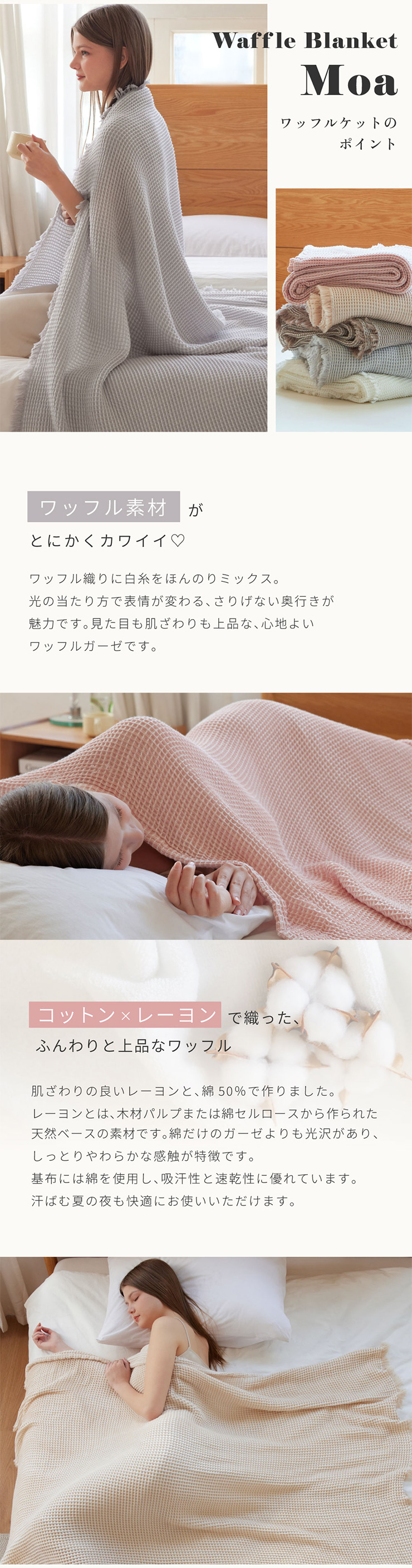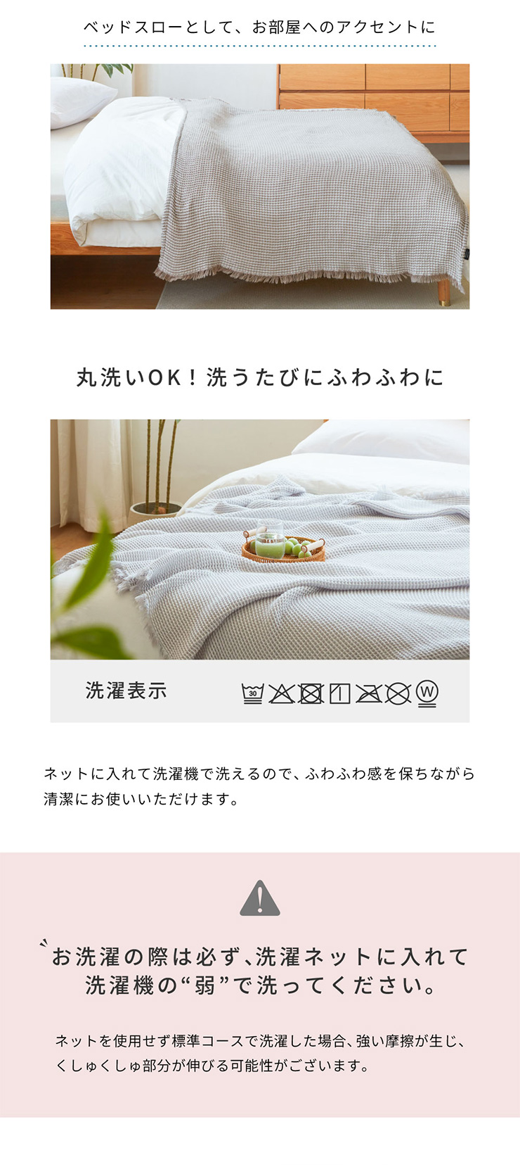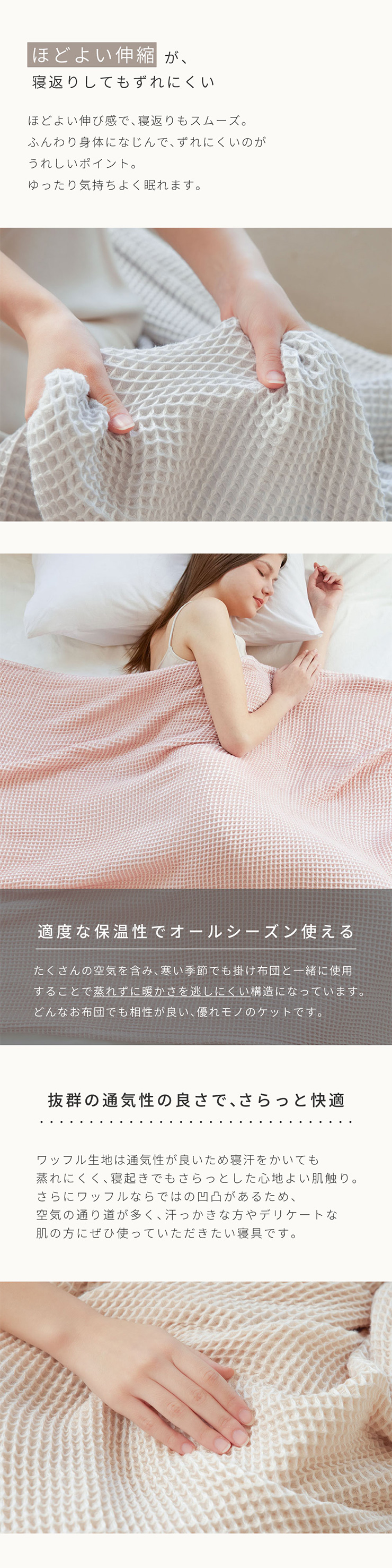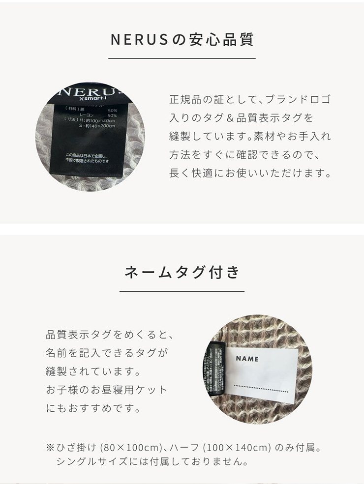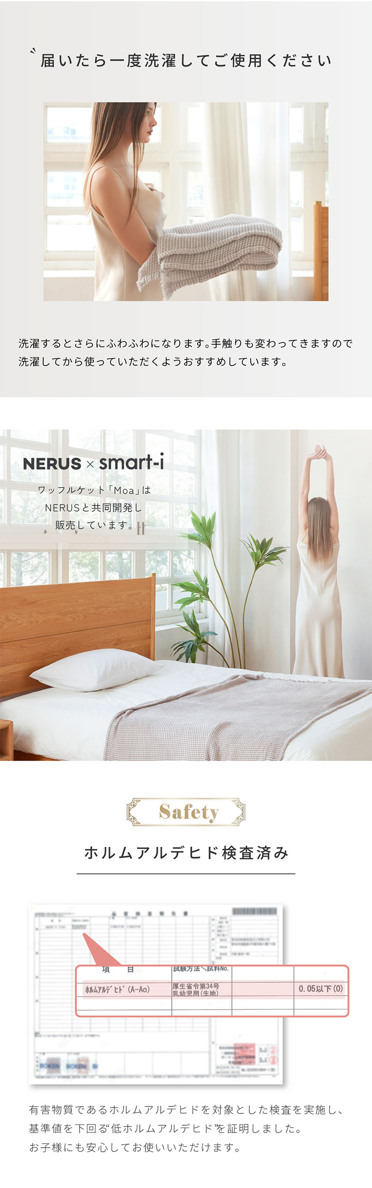 ワッフルケットMoa(モア) ハーフサイズ 繊細なワッフル織りが生む立体感と通気性。心までときほぐす、やさしい肌触り。毎日の眠りがちょっと特別になるワッフルガーゼケットです。 ■ワッフル素材がとにかくかわいい ワッフル織りに白糸をほんのりミックス。光の当たり方で表情が変わり、奥行があるデザインです。見た目も肌触りも上品で、寝室を涼やかに彩ります。 ■コットンxレーヨンで織った、ふんわりと上品なワッフル 肌触りの良いレーヨンと、綿50%で構成されているため、軽やかでやさしい、上品なデザインです。綿だけのガーゼよりも光沢があり、しっとり柔らかな感触が特徴です。 ■程よい伸縮が、寝返りしても崩れにくい 程よい伸び感で、寝返りもスムーズ。ふんわり身体に馴染んで、ズレにくいのが嬉しいポイント。ゆったり気持ちよく眠れます。 ■適度な保温性でオールシーズン使えます たくさんの空気を含み、寒い季節でも掛け布団と一緒に使用することで蒸れずに暖かさを逃がしにくい構造になっています。どんなお布団でも相性がいい、優れモノのケットです。 ■抜群の通気性の良さで、サラッと快適 ワッフル生地は通気性が良いため寝汗をかいても蒸れにくく、寝起きでもサラッとした心地よい肌触り。空気の通り道が多く、汗っかきな方やデリケートな肌の方にぜひ使っていただきたい寝具です。 ■丸洗いOK!洗うたびにふわふわに ネットに入れて洗濯機で洗えるので、ふわふわ感を保ちながら清潔にお使いいただけます。洗濯するとさらにふわふわになります。手触りも変り、洗濯してから使っていただくようおすすめしています。 ■NERUSの安心品質 正規品の証として、ブランドロゴ入りのタグ&品質表示タグを縫製しています。素材やお手入れ方法をすぐに確認できるので、長く快適にお使いいただけます。 ■ネームタグ付き 品質表示タグをめくると、名前を記入できるタグが縫製されています。お子様のお昼寝用ケットにもオススメです。 ※商品写真はできる限り実物の色に近づけるよう徹底しておりますが、お使いのモニター設定、お部屋の照明により実際の商品と若干色味が異なる場合がございますので、予めご了承ください。 ※製造ロットにより色や縫製のブレが発生する場合がございます。 ※開封時や使い始めでは、毛羽立ちや綿くずが出ることがありますが、次第にでなくなります。使うほどに生地が締まり、風合いもよくなります。 ※お洗濯の際は必ず、洗濯ネットに入れて洗濯機の【弱】で洗ってください。ネットを使用せず、標準コースで選択した場合、強い摩擦が生じ、生地が伸びる可能性がございます。 ※こちらは、ハーフサイズの商品ページとなります。画像で同シリーズのサイズ違いを使用している場合がございます。商品サイズをご確認の上ご購入をお願いします。 ※ネームタグはひざ掛け・ハーフサイズのみ付属となっております。シングルサイズには付属しておりません。 | |