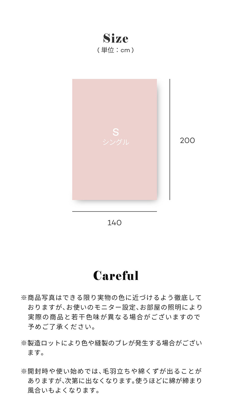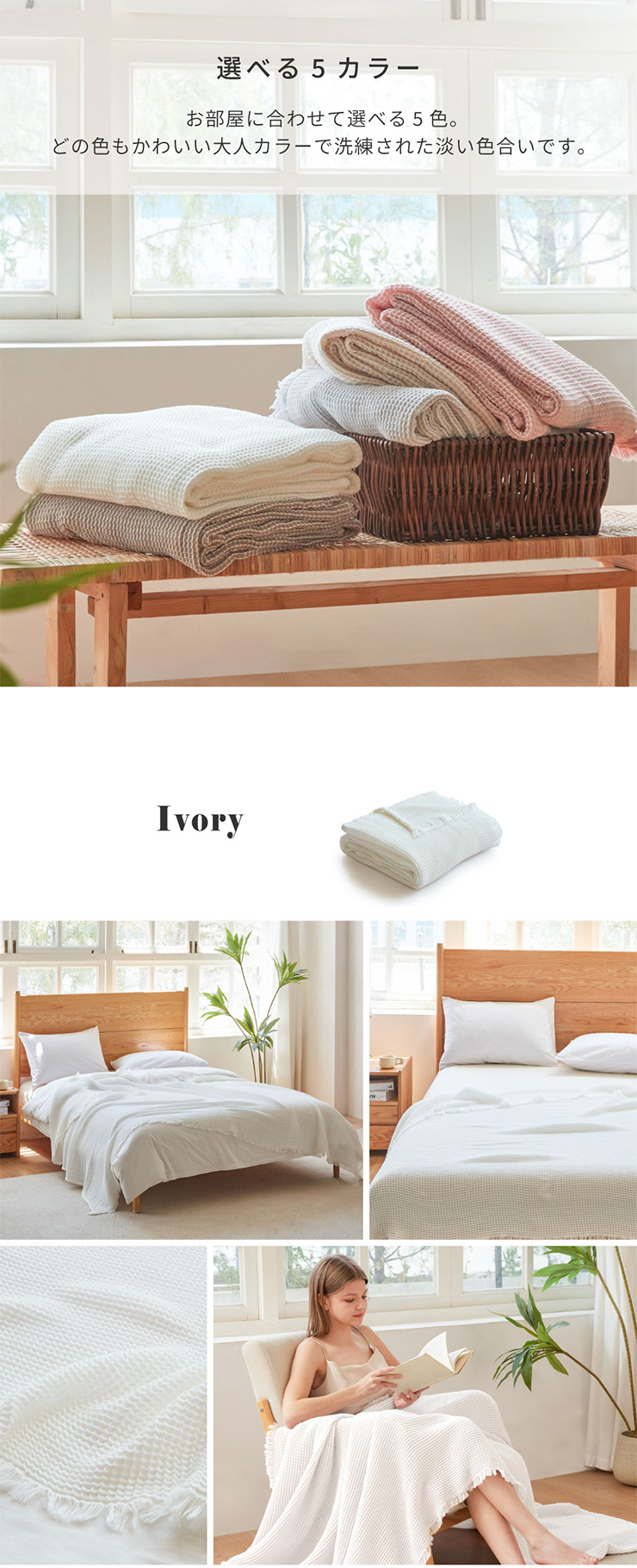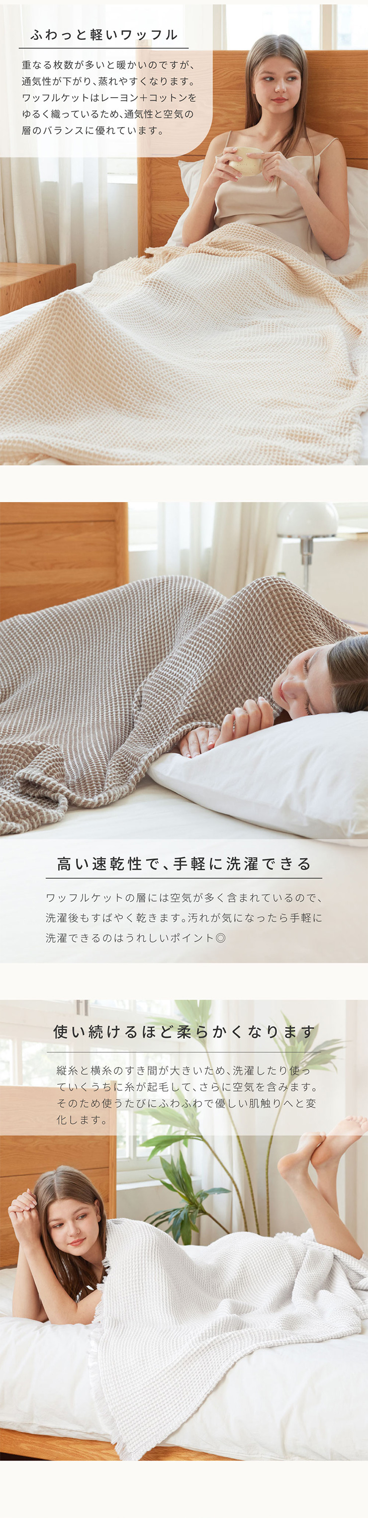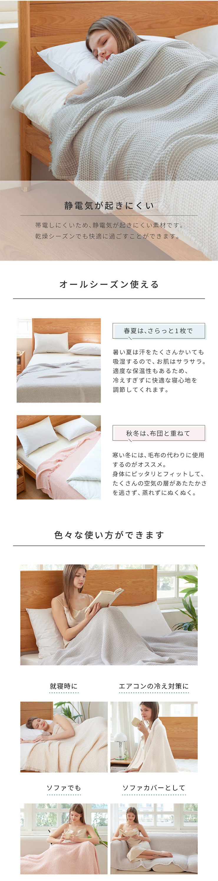 ワッフルケットMoa(モア) ハーフサイズ 繊細なワッフル織りが生む立体感と通気性。心までときほぐす、やさしい肌触り。毎日の眠りがちょっと特別になるワッフルガーゼケットです。 ■ワッフル素材がとにかくかわいい ワッフル織りに白糸をほんのりミックス。光の当たり方で表情が変わり、奥行があるデザインです。見た目も肌触りも上品で、寝室を涼やかに彩ります。 ■コットンxレーヨンで織った、ふんわりと上品なワッフル 肌触りの良いレーヨンと、綿50%で構成されているため、軽やかでやさしい、上品なデザインです。綿だけのガーゼよりも光沢があり、しっとり柔らかな感触が特徴です。 ■程よい伸縮が、寝返りしても崩れにくい 程よい伸び感で、寝返りもスムーズ。ふんわり身体に馴染んで、ズレにくいのが嬉しいポイント。ゆったり気持ちよく眠れます。 ■適度な保温性でオールシーズン使えます たくさんの空気を含み、寒い季節でも掛け布団と一緒に使用することで蒸れずに暖かさを逃がしにくい構造になっています。どんなお布団でも相性がいい、優れモノのケットです。 ■抜群の通気性の良さで、サラッと快適 ワッフル生地は通気性が良いため寝汗をかいても蒸れにくく、寝起きでもサラッとした心地よい肌触り。空気の通り道が多く、汗っかきな方やデリケートな肌の方にぜひ使っていただきたい寝具です。 ■丸洗いOK!洗うたびにふわふわに ネットに入れて洗濯機で洗えるので、ふわふわ感を保ちながら清潔にお使いいただけます。洗濯するとさらにふわふわになります。手触りも変り、洗濯してから使っていただくようおすすめしています。 ■NERUSの安心品質 正規品の証として、ブランドロゴ入りのタグ&品質表示タグを縫製しています。素材やお手入れ方法をすぐに確認できるので、長く快適にお使いいただけます。 ■ネームタグ付き 品質表示タグをめくると、名前を記入できるタグが縫製されています。お子様のお昼寝用ケットにもオススメです。 ※商品写真はできる限り実物の色に近づけるよう徹底しておりますが、お使いのモニター設定、お部屋の照明により実際の商品と若干色味が異なる場合がございますので、予めご了承ください。 ※製造ロットにより色や縫製のブレが発生する場合がございます。 ※開封時や使い始めでは、毛羽立ちや綿くずが出ることがありますが、次第にでなくなります。使うほどに生地が締まり、風合いもよくなります。 ※お洗濯の際は必ず、洗濯ネットに入れて洗濯機の【弱】で洗ってください。ネットを使用せず、標準コースで選択した場合、強い摩擦が生じ、生地が伸びる可能性がございます。 ※こちらは、ハーフサイズの商品ページとなります。画像で同シリーズのサイズ違いを使用している場合がございます。商品サイズをご確認の上ご購入をお願いします。 ※ネームタグはひざ掛け・ハーフサイズのみ付属となっております。シングルサイズには付属しておりません。 | |