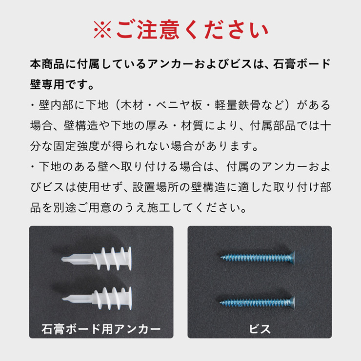 | スタンドミラー Front(フロント) アーチ型 60x160cm あなたの毎日に、寄り添う。アルミ製ミラー。毎日のリズムを、整えてくれるミラーです。 ■傷や歪みに強く、経年劣化しにくい。長く使えるガラス製ミラー クリアで歪みの少ないガラス製ミラーを使用しています。ガラス表面は傷に強く、毎日使っても映りの質が劣化しにくいため、長期使用に適しています。 ■安全面にも配慮した安心設計。衝撃に強い強化ガラス使用 ミラー部分には、割れにくく耐久性に優れた強化ガラスを採用。日常使いでも安心できる、丈夫さにこだわったつくりです。 ■万が一割れてしまっても安心。飛散防止フィルム ミラーの裏面には、破片の飛び散りを防ぐ飛散防止フィルムを施しています。万が一の破片時にもケガのリスクを軽減できる、安全性を考えた仕様です。 ■光を取り込み、奥行を演出。空間を広く、明るく見せる効果も。 鏡の反射により、自然光や照明の光を室内に広げることで、空間全体が明るく感じられます。奥行が生まれ、お部屋が広く見える視覚効果も期待できます。 ■シャープさの中に、やさしさを。やわらかなアーチのアルミフレーム 丈夫で清潔感のあるアルミ素材を、上品な艶消し仕上げでマットに仕立てました。厚み19mmの薄型設計が、圧迫感なく空間にすっとなじみます。 ■置いても、掛けても使える。選べる設置スタイル 床置きはもちろん、付属の金具を使えば壁掛け設置も可能。お部屋のレイアウトや使い方に合わせて、スタイルを選べます。 ■床置き用パーツ 滑り止め&キズ防止:設置面には、滑り止め効果のあるゴム製パーツを使用。ミラーのズレを防ぎ、床への傷つきも軽減します。 転倒防止用キット:付属の転倒防止パーツで壁にしっかりと固定できます。地震などの揺れによる転倒リスクを軽減し、お子様やペットのいるご家庭でも安心です。 ■壁掛け用パーツ 本体には取り付け金具を装備。石膏ボード用アンカーとビス付きで壁の材質に応じてしっかりと固定できます。 ■お手入れ用クロス付き ミラー表面のお手入れに便利なクロスが付属。指紋やほこりが気になる時も、サッと拭くだけで美しい映りを保てます。 ※画像で同シリーズのサイズ、形状違いを使用している場合がございます。 商品サイズをご確認の上ご購入をお願いします。 ※本商品に付属しているアンカーおよびビスは、石膏ボード壁専用です。 ※壁内部に下地(木材・べニヤ板・軽量鉄骨など)がある場合、壁構造や下地の厚み・材質により、付属部品では十分な固定強度が得られない場合があります。 ※下地のある壁へ取り付ける場合は、付属のアンカーおよびビスは使用せず、設置場所の壁構造に適した取り付け部品を別途ご用意の上施工してください。 | |