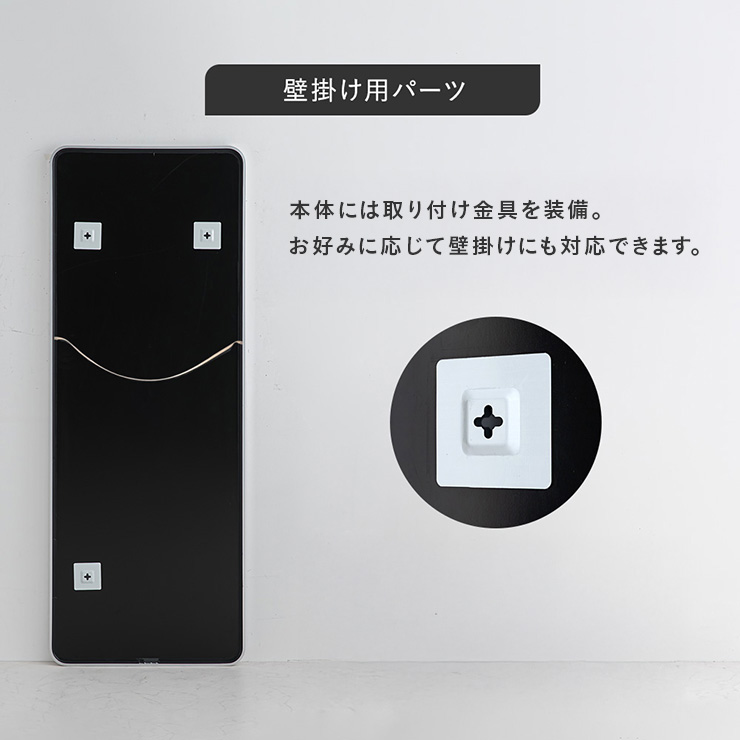 | スタンドミラー Ftont(フロント) 長方形 60x160cm あなたの毎日に、寄り添う。アルミ製ミラー。毎日のリズムを、整えてくれるミラーです。 ■傷や歪みに強く、経年劣化しにくい。長く使えるガラス製ミラー クリアで歪みの少ないガラス製ミラーを使用しています。ガラス表面は傷に強く、毎日使っても映りの質が劣化しにくいため、長期使用に適しています。 ■安全面にも配慮した安心設計。衝撃に強い強化ガラス使用 ミラー部分には、割れにくく耐久性に優れた強化ガラスを採用。日常使いでも安心できる、丈夫さにこだわったつくりです。 ■万が一割れてしまっても安心。飛散防止フィルム ミラーの裏面には、破片の飛び散りを防ぐ飛散防止フィルムを施しています。万が一の破片時にもケガのリスクを軽減できる、安全性を考えた仕様です。 ■光を取り込み、奥行を演出。空間を広く、明るく見せる効果も。 鏡の反射により、自然光や照明の光を室内に広げることで、空間全体が明るく感じられます。奥行が生まれ、お部屋が広く見える視覚効果も期待できます。 ■シャープさの中に、やさしさを。角を丸く仕上げたスクエアフレーム 丈夫で清潔感のあるアルミ素材を、美しい光沢感のある仕上げで上品に整えました。厚み19mmの薄型設計が、圧迫感なく空間にすっとなじみます。 ■置いても、掛けても使える。選べる設置スタイル 床置きはもちろん、付属の金具を使えば壁掛け設置も可能。お部屋のレイアウトや使い方に合わせて、スタイルを選べます。 ■床置き用パーツ 滑り止め&キズ防止:設置面には、滑り止め効果のあるゴム製パーツを使用。ミラーのズレを防ぎ、床への傷つきも軽減します。 転倒防止用キット:付属の転倒防止パーツで壁にしっかりと固定できます。地震などの揺れによる転倒リスクを軽減し、お子様やペットのいるご家庭でも安心です。 ■壁掛け用パーツ 本体には取り付け金具を装備。石膏ボード用アンカーとビス付きで壁の材質に応じてしっかりと固定できます。 ■お手入れ用クロス付き ミラー表面のお手入れに便利なクロスが付属。指紋やほこりが気になる時も、サッと拭くだけで美しい映りを保てます。 ※画像で同シリーズのサイズ、形状違いを使用している場合がございます。 商品サイズをご確認の上ご購入をお願いします。 ※本商品に付属しているアンカーおよびビスは、石膏ボード壁専用です。 ※壁内部に下地(木材・べニヤ板・軽量鉄骨など)がある場合、壁構造や下地の厚み・材質により、付属部品では十分な固定強度が得られない場合があります。 ※下地のある壁へ取り付ける場合は、付属のアンカーおよびビスは使用せず、設置場所の壁構造に適した取り付け部品を別途ご用意の上施工してください。 | |