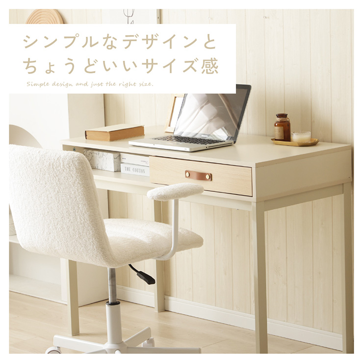 | デスク 幅100cm Simple Modern Desk(シンプルモダンデスク) シンプルなデザインとちょうどいいサイズ感で、空間に調和しやすいホワイトカラーのデスクです。 ■便利な収納付きで、コンパクトにまとまる コンパクトながら引き出しとオープンスペースを搭載しているためお部屋がスッキリまとまります。 ■開閉が簡単で便利な引き出し付き スライドレールを採用しているため、少ない力で簡単にスムーズな開閉が可能です。 ■取っ手は手触りの良いレザー素材を使用 ■ちょっと置くのに最適なオープン収納スペース 引き出し横にオープンスペースがあり、本やポーチなど日常で使う小物を収納することができます。 ■圧迫感なく使える100x50cmの天板 1人暮らしのお部屋や作業部屋に置いても圧迫感のないサイズながらしっかり作業スペースも確保できる広さの天板です。 ※製造時に生じる若干の個体差や、測定方法により表記と多少異なる場合がございます。予めご了承ください。 ※こちらの商品はお客様組み立てとなります。 ※組み立てにはプラスドライバーをご準備いただく必要があります ※画面上のカラーはブラウザや設定により、実物とは若干異なる場合がございます。あらかじめご了承の上ご注文ください。 | |