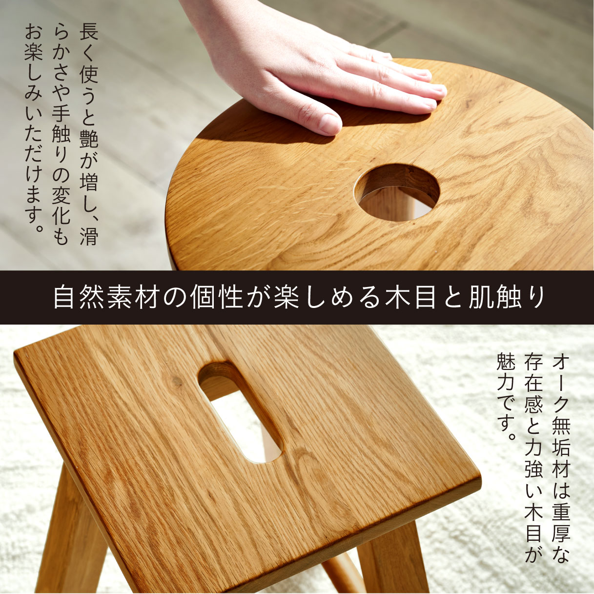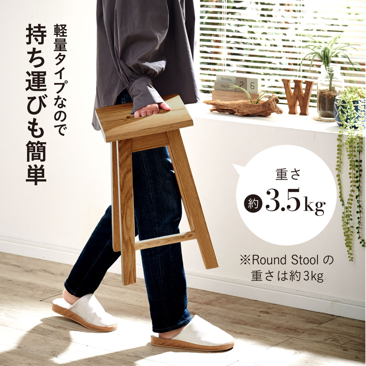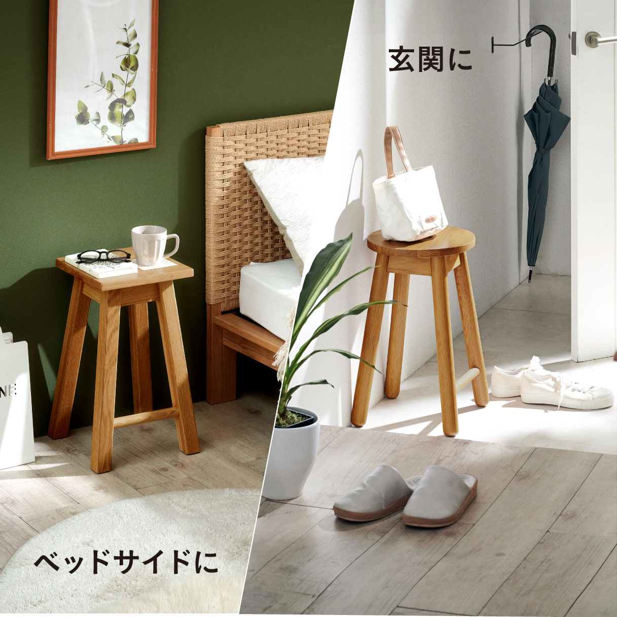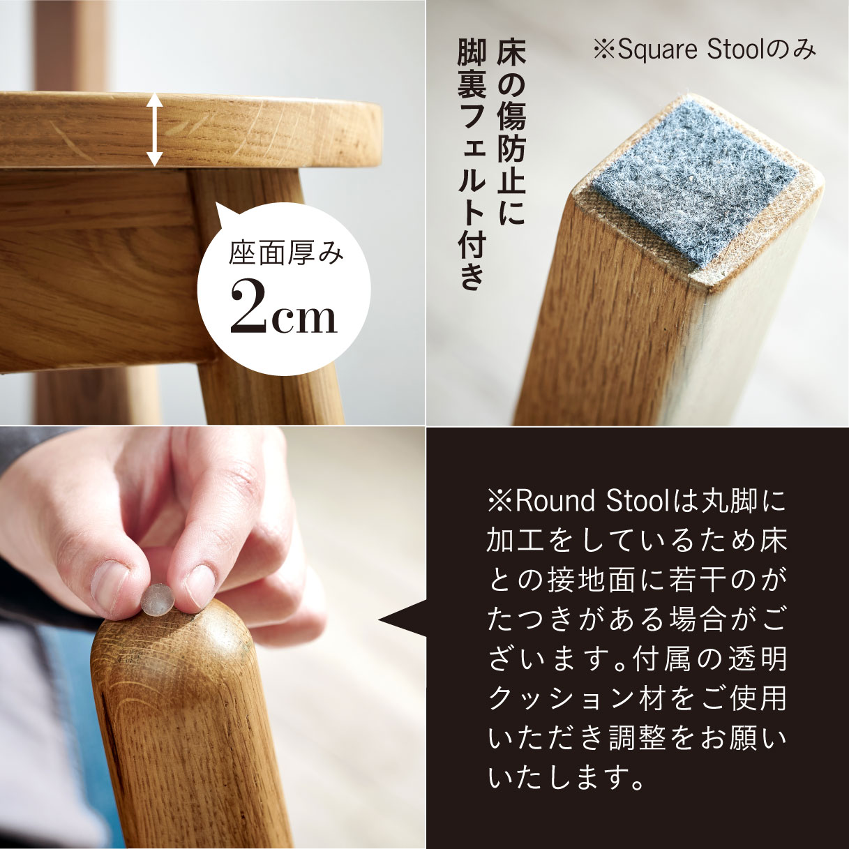 暮らしに溶け込む天然木スツール Visco(ビスコ) ■お部屋の雰囲気に合わせて選べる2type Round Stool:丸いフォルムがインテリアに馴染みやすく、いろんなシーンで活躍してくれます。 Square Stool:コーナーがあることで壁や家具に設置しやすく限られたスペースも美しく整います。 ■自然素材の個性が楽しめる木目と肌触り 上質な天然木の風合いをそのままに、やさしい佇まいのオーク無垢材を使用しました。 長く使うと艶が増し、滑らかさや手触りの変化もお楽しみいただけます。オーク無垢材は重厚な存在感と力強い木目が魅力です。 ■丁度いい座面高 高すぎず低すぎない、コンパクトでシンプルなスツール。さまざまなシーンでお使いいただけて、おしゃれで実用的なアイテムです。 ■軽量タイプなので持ち運びも簡単に行えます。 ■床の傷防止に脚裏フェルト付き ※こちらの商品は完成品となります。 ※こちらは、単品販売となります。 ※こちらの商品は、天然木を使用しております。その為、木の表情や風合いには個体差がございます。節など木の風合いを理由とした返品・交換は対象外となりますので予めご了承ください。 ※脚裏フェルトはSquare Stoolのみとなります。Round Stoolは丸脚に加工しているため床との設置面に若干のガタツキがある場合がございます。付属の透明クッション材をご使用いただき調節をお願いいたします。 ※若干の個体差によって、表記サイズと完成形のサイズに多少の誤差が生じる場合がございます。予めご了承ください。 ※防水ではございませんので、濡れた場合は放置せずすぐに拭き取ってください。 | |