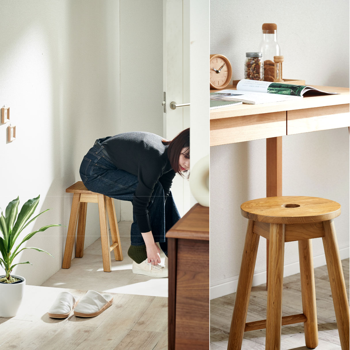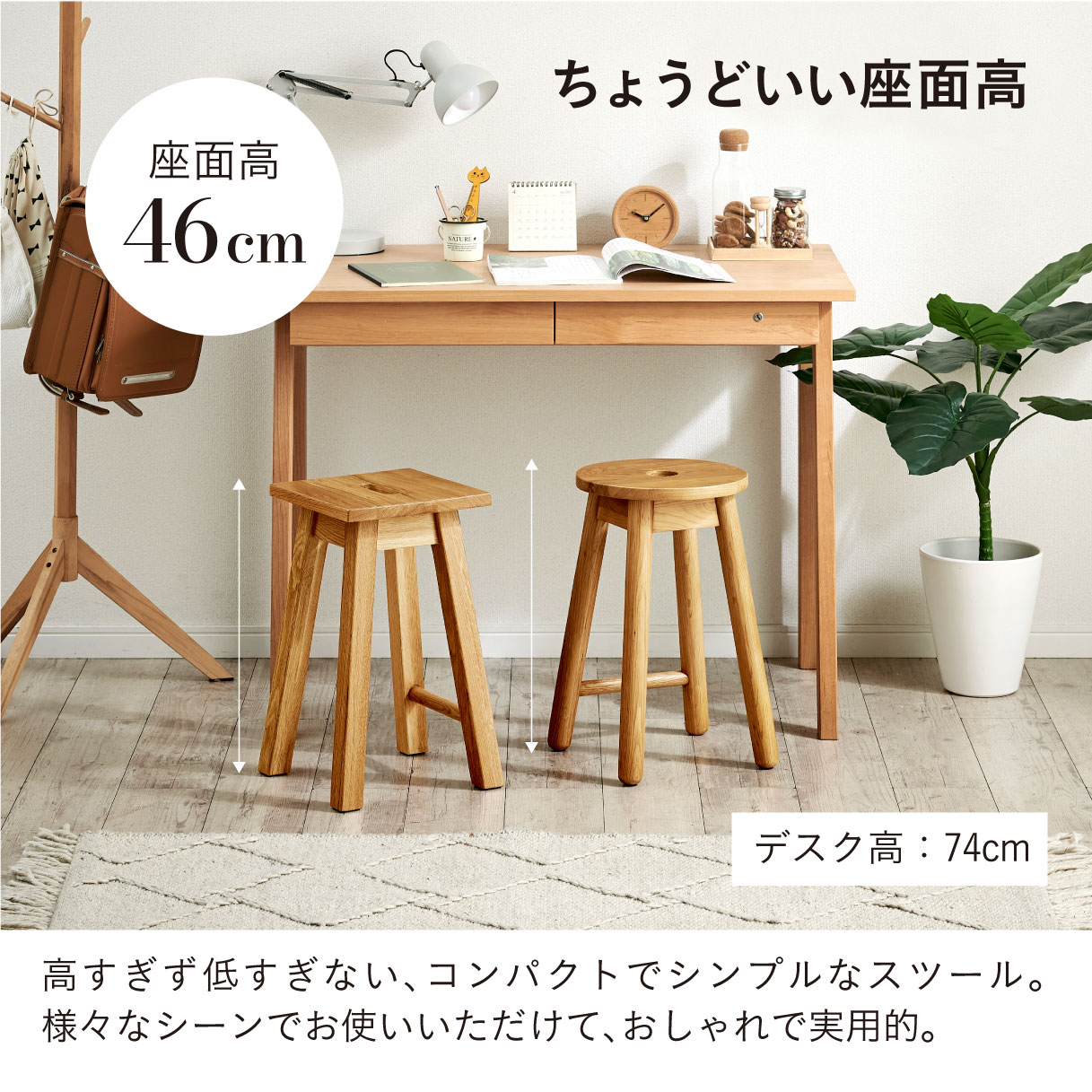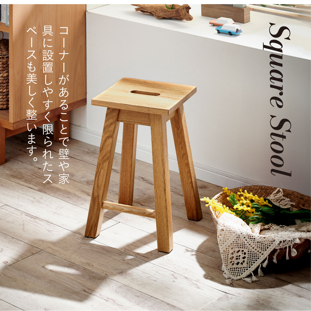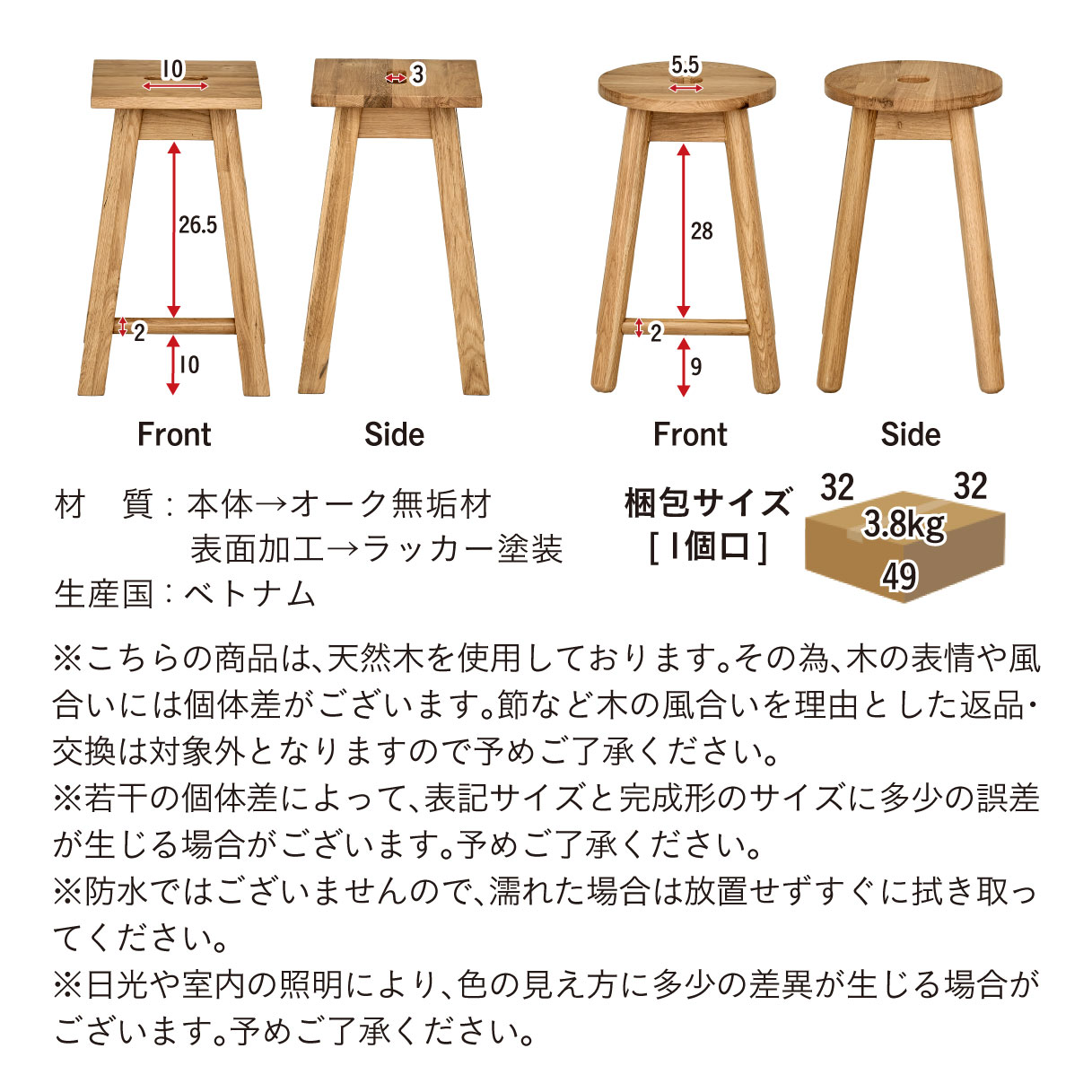 暮らしに溶け込む天然木スツール Visco(ビスコ) ■お部屋の雰囲気に合わせて選べる2type Round Stool:丸いフォルムがインテリアに馴染みやすく、いろんなシーンで活躍してくれます。 Square Stool:コーナーがあることで壁や家具に設置しやすく限られたスペースも美しく整います。 ■自然素材の個性が楽しめる木目と肌触り 上質な天然木の風合いをそのままに、やさしい佇まいのオーク無垢材を使用しました。 長く使うと艶が増し、滑らかさや手触りの変化もお楽しみいただけます。オーク無垢材は重厚な存在感と力強い木目が魅力です。 ■丁度いい座面高 高すぎず低すぎない、コンパクトでシンプルなスツール。さまざまなシーンでお使いいただけて、おしゃれで実用的なアイテムです。 ■軽量タイプなので持ち運びも簡単に行えます。 ■床の傷防止に脚裏フェルト付き ※こちらの商品は完成品となります。 ※こちらは、単品販売となります。 ※こちらの商品は、天然木を使用しております。その為、木の表情や風合いには個体差がございます。節など木の風合いを理由とした返品・交換は対象外となりますので予めご了承ください。 ※脚裏フェルトはSquare Stoolのみとなります。Round Stoolは丸脚に加工しているため床との設置面に若干のガタツキがある場合がございます。付属の透明クッション材をご使用いただき調節をお願いいたします。 ※若干の個体差によって、表記サイズと完成形のサイズに多少の誤差が生じる場合がございます。予めご了承ください。 ※防水ではございませんので、濡れた場合は放置せずすぐに拭き取ってください。 | |