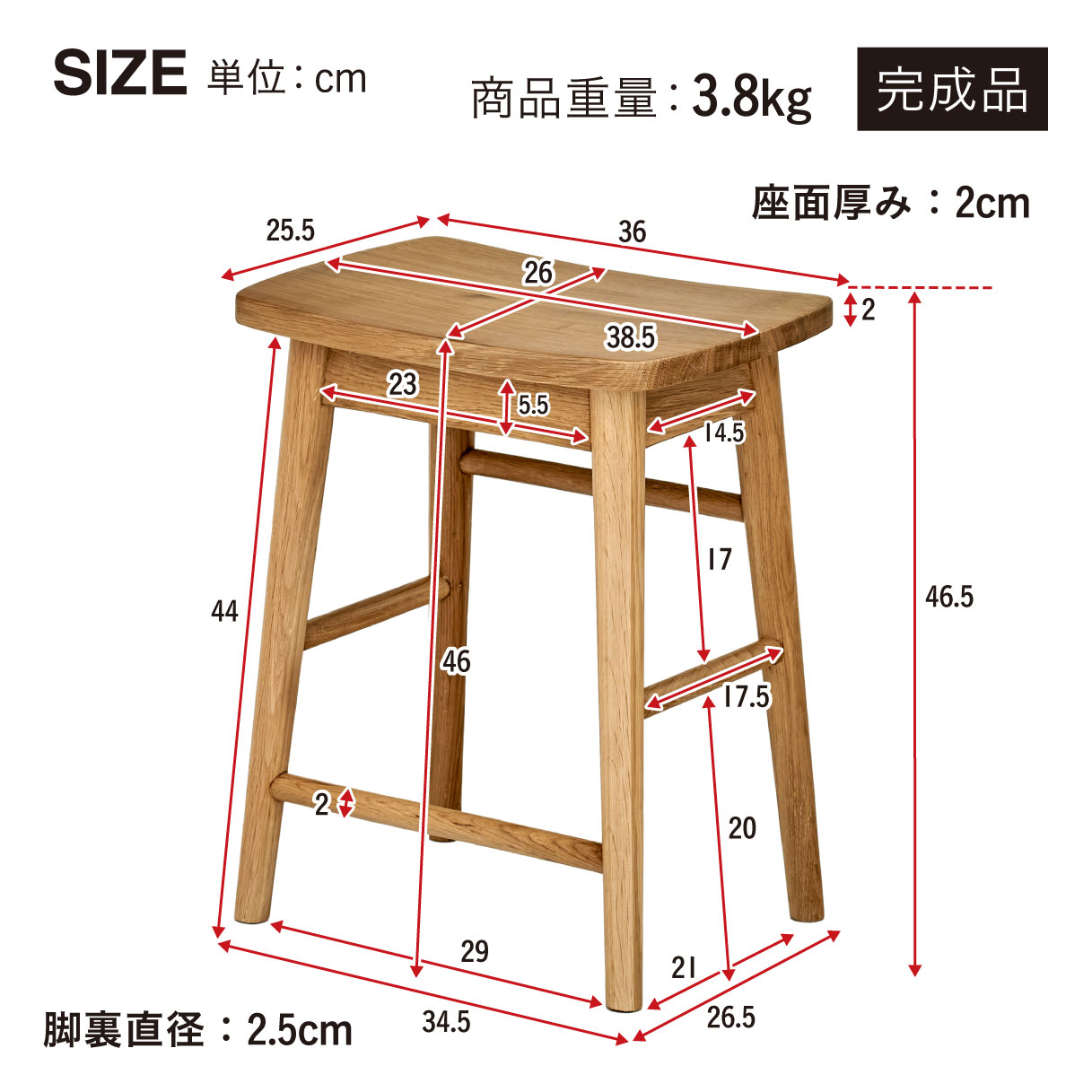 サイズ | 本体:約W38.5 x D26.5 x H46.5cm(商品重量:3.8kg) 座面:約W38.5 x D26 x H2cm |