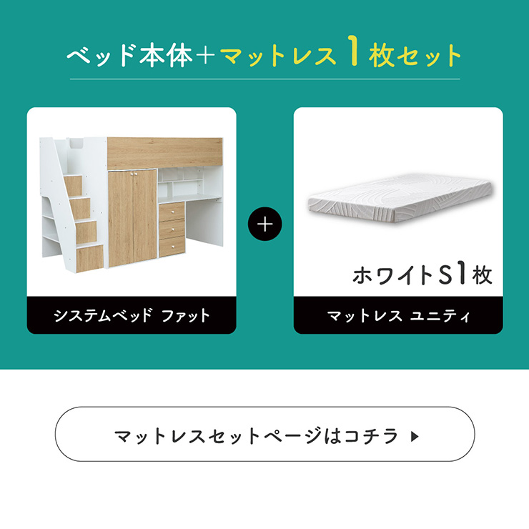 | System bed Phat(ファット) 「学習・収納・就寝」全部これ1台!左右どちらにも設置できる階段付きシステムベッド ■2種類のデスクで広い作業スペースを確保 異なるタイプのデスクをL字型に配置し、パソコン作業や書き物に最適な広々とした作業やスペースを実現 ■広い作業スペース ベッド下デスク デスクとして使用しない時でもお好きな雑貨などを置いておしゃれに飾ることもできます。コードの逃し穴付き ■好きなところに移動可能 キャスター付きデスク キャスターは左右に真っ直ぐ動くので出し入れの際にチェストなどにぶつける心配はありません。分割して使用可能 ■嬉しい大容量の収納スペース ベッドと一体になったワードローブやチェストだけでなく、階段のステップ下サイドやベッド下デスクの正面、キャスター付きデスク下など多数の収納スペースを設けました。 ■高さのあるベッドでも安心安全 落下を防止するためにサイドフレームを高くし、ワードローブやチェストをベッドに固定することで耐震機能も強化しました。 ■ベッド静止耐荷重100kg・ステップ静止耐荷重80kg ■上り下りもラクラク。お子さまも安心 ベッド横に大きな階段を設けました。はしごタイプに比べて上り下りしやすいステップタイプ。手すり付きでお子さまも安心です。階段は左右どちらにも設置していただけます。 ■角には安心の丸み加工を施しています ※こちらの商品はお客様組み立てとなります。 ※耐荷重検査は静止耐荷重です。ベッドの上で激しく動く、急激な力を加える、飛び跳ねるなど、1点に集中して負荷をかける行為はお控えください。 ※リアルな木目調シートを採用しております。木目や節・傷に見えるダメージ加工・ヴィンテージ加工などは全てシートデザインとなります。これらを理由とした返品・交換は行っておりませんので、予めご了承ください。 ※組み立て方や若干の個体差によって、表記サイズと完成形のサイズに多少の誤差が生じる場合がございます。 ※こちらの商品はべッド本体のみの販売となります。マットレスは別売りとなります。 ※ベッドとチェスト&ワードローブは一体型です。別々にはご使用いただけません。 ※危険ですので、ワードローブ内に入って遊ばないでください。 | |