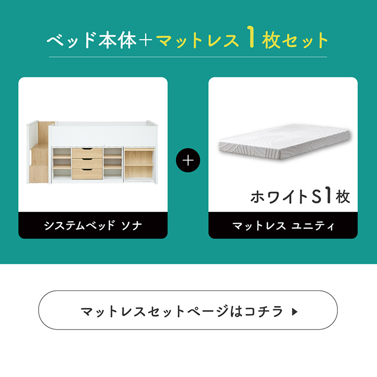| Low Type System Bed Sona(ソナ) もっとおしゃれに、もっと快適に。 理想の空間を叶えるシステムベッド ■空間を無駄なく使える3点セット ・安心のロータイプ ・たっぷり大容量収納 ・上り下りしやすいステップ階段 ■階段タイプで上り下りがラクラク ※ステップは固定となっており、左右の入れ替えはできません。 ■ベッド高112.5cmのロータイプシステムベッド 圧迫感が少なく、ハイタイプに比べて天井が高く感じられるので、より開放的な空間に。 女性の方でも寝具の上げ下ろしがしやすい高さです。 ■2段のオープンラック付きデスク。 デスクから手の届く位置にあるので、使いたいものをサッと取り出せてとっても便利。 散らかりがちなデスク上もスッキリ片付き、快適な作業空間をキープできます。 ■キャスター付きでお子さまでも出し入れ簡単 左右にだけ動かせるキャスターを採用。 まっすぐ動かせるので出し入れの際に周囲にぶつける心配がありません。 ■奥行きたっぷりのオープンシェルフ 棚板は全て3cm間隔3段階の可動式のため、収納するものに合わせて調節が可能です。 ■衣類もおもちゃもたっぷり収納!3段チェスト 力を入れずに開閉できるスライドレール仕様の3段チェストはお子さまでも出し入れ簡単♪ ■ベッド下を有効活用!収納力アップでお部屋スッキリ チェストを設置しても収納スペースに使える余裕があるので、シーズンオフの寝具や衣服など、見せない収納としてもお使いいただけます。 ■ランドセルも収納できる奥行きたっぷりの階段下収納 ■「清潔感×ナチュラル」 空間にやさしい明るさと自然な温もりをプラスしたデザインに仕上げました。 ※こちらの商品はお客様組み立てとなります。 ※組み立て方や若干の個体差によって、表記サイズと完成形のサイズに多少の誤差が生じる場合がございます。予めご了承ください。 ※耐荷重検査は静止耐荷重です。ベッドの上で激しく動く、急激な力を加える、飛び跳ねるなど1点に集中して負荷をかける行為はお控えください。 | |