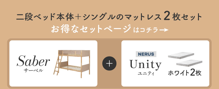 | 暮らしに映える二段ベッド Saber(サーベル) ■長く使えるポイントがたくさん ・シンプルなデザイン&カラー ・分割仕様OK ・斜めはしごで登りやすい ・ベッド下に収納スペース ■ラバーウッド材×ナチュラルカラー どんな空間にも溶け込む柔らかな存在感 ■Point 01.広い下段スペース シーズンオフ用品の収納に最適なスペース 広い空間高で成長後も安心、ゆとりの空間 ■Point 02.分割仕様で長く使える 子供部屋に。 一人暮らし用のベッドとしても ■Point 03.斜めはしごで登りやすい安全設計 はしごは左右付け替えが可能。 お部屋の間取りに合わせて左右どちらに付けるか選べるので、レイアウトで迷う必要もありません。 ■耐震仕様 連結部はダボだけでなくビスで固定する二重固定で、横揺れの対策をしています。 第三者検査機関の耐荷重試験を合格 ※耐荷重検査は静止耐荷重です。ベッドの上で激しく動く、急激な力を加える、飛び跳ねるなど1点に集中して負荷をかける行為はお控えください。 ※こちらの商品はお客様組み立てとなります。 ※組み立て方や若干の個体差によって、表記サイズと完成形のサイズに多少の誤差が生じる場合がございます。予めご了承ください。 ※こちらの商品はベッド本体のみの販売となります。マットレス等は付属しておりません。 ※本商品に使用されているLVLボードは、素材の特性上、キズ・加工跡等が見られる場合がございます。これらは使用上の問題はなく、強度や性能に影響はございません。そのため、見た目に関する理由での返品・交換はお受けできかねますので、あらかじめご了承ください。 | |
