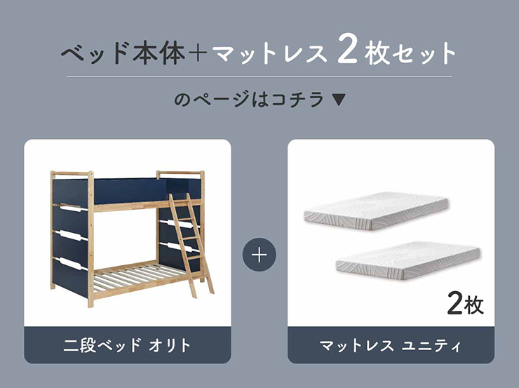 | シンプルだから、暮らしにずっと馴染む Bunk Bed Orit(オリト) ■checkpoint ・選べる4カラー ・一体型で地震に強い ・支柱天然木 ・低めの下段、安心をプラス ■ラバーウッド材×ナチュラルカラー 暮らしと調和する、シンプルな美しさ ■Point 01.S字フックで広がるベッド空間 アイデア次第で自分だけの空間に ■Point 02.一体型構造で地震にも強い 頑丈なつくりが暮らしを守ります。 ※分割機能はございません。 ■Point 03.のびのび使える広々下段 低めの設計で下段空間をしっかり確保 ■Point 04.斜めはしごでラクラク 安定感ある斜め設計で、登り降りも安心 ■Point 05.天然木のぬくもりと耐久性 丈夫な天然木の柱で安定感アップ ■Point 06.高めのサイドフレームで安心 高さを十分にとり、お子さまも安心 ■Point 07.やさしい角丸設計 角を丸く仕上げているので、毎日安心 ■Point 08.安心の強度テスト合格 300kg静止耐荷重試験を公的機関でクリア。 毎日の仕様にも安心と上部をお届けします。 ※耐荷重検査は静止耐荷重です。ベッドの上で激しく動く、急激な力を加える、飛び跳ねるなど1点に集中して負荷をかける行為はお控えください。 ※こちらの商品はお客様組み立てとなります。 ※組み立て方や若干の個体差によって、表記サイズと完成形のサイズに多少の誤差が生じる場合がございます。予めご了承ください。 ※こちらの商品はベッド本体のみの販売となります。マットレス等は付属しておりません。 ※本商品に使用されているLVLボードは、素材の特性上、キズ・加工跡等が見られる場合がございます。これらは使用上の問題はなく、強度や性能に影響はございません。そのため、見た目に関する理由での返品・交換はお受けできかねますので、あらかじめご了承ください。 | |