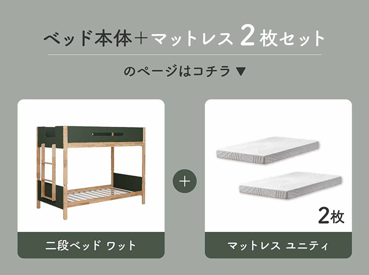 | シンプルで美しい、北欧スタイルの二段ベッド Wat(ワット) ■大きくなっても使えるポイントがたくさん ・選べる4color ・分割仕様OK ・省スペースな垂直はしご ・広い収納スペース ■Point 01.分割仕様で長く使える セパレートタイプなのでシングルベッドとしても◎ ■Point 02.ベッド下を収納に使える高めの設計 ベッド下を収納など自由なスペースに。 ■Point 03.省スペースな固定式はしご お子様の寝顔も見られる、ベッド高107cm ■safety 毎日安心して使える角丸設計 ■耐震仕様 連結部はダボだけでなくビスで固定する二重固定で、横揺れの対策をしています。 第三者検査機関の耐荷重試験を合格 ※耐荷重検査は静止耐荷重です。ベッドの上で激しく動く、急激な力を加える、飛び跳ねるなど1点に集中して負荷をかける行為はお控えください。 ※こちらの商品はお客様組み立てとなります。 ※組み立て方や若干の個体差によって、表記サイズと完成形のサイズに多少の誤差が生じる場合がございます。予めご了承ください。 ※こちらの商品はベッド本体のみの販売となります。マットレス等は付属しておりません。 ※本商品に使用されているLVLボードは、素材の特性上、キズ・加工跡等が見られる場合がございます。これらは使用上の問題はなく、強度や性能に影響はございません。そのため、見た目に関する理由での返品・交換はお受けできかねますので、あらかじめご了承ください。 | |