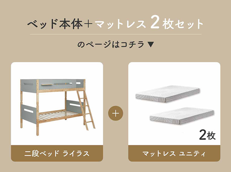 | 選べる楽しさ、飽きないデザイン Bunk Bed Lylas(ライラス) ■Recommend Point ・シンプルデザイン ・シングルベッドのパターンが複数 ・左右どちらでもはしごが使える ・選べる4color ■どんな部屋にも馴染むシンプルデザイン すっきりとしたデザインで、どんなテイストの部屋にも自然に調和します。 スマホや目覚ましを置くのに便利な飾り棚付き。実はうれしいこの機能♪ ■ライフスタイルが変わっても使える分割仕様 上下を分割してシングルベッドとしてお使いいただくこともできます。 2台を並べて使用したり、別々のお部屋で使用したり、ライフスタイルやお子さまの成長に合わせて使えるベッドです。 ■分割後は手摺りの付け外しが可能になり、シングルベッドにした際のパターンをお選びいただけます。 ・上下段を分割して、そのままシングルベッドとして使用(上段サイドフレーム付き) ・上下段を分割して、そのままシングルベッドとして使用(上段サイドフレームなし) ・それぞれヘッドボード・フットボードの高さを揃えたシングルベッド ■ベッド下を収納に使える高めの設計 ベッド下は高めの設計なので収納スペースとしてもお使いいただけます。 さらに、はしごは取り外し可能なので、掃除もストレスなく行えます。 ■左右どちらでも使える斜めがけのはしご 簡単に着脱が行えるはしごで、左右どちらにも取り付け可能。 お部屋のレイアウトやスペースに合わせて、柔軟に設置できます。 斜めがけのはしごなので上り下りしやすく、小さなお子さまも安心してお使いいただけます。 少しでもお子さまへの危険がなくなるよう、角は全て丸みをつけて安全性アップ。 ※耐荷重検査は静止耐荷重です。ベッドの上で激しく動く、急激な力を加える、飛び跳ねるなど1点に集中して負荷をかける行為はお控えください。 第三者検査機関の耐荷重試験を合格 ※こちらの商品はお客様組み立てとなります。 ※組み立て方や若干の個体差によって、表記サイズと完成形のサイズに多少の誤差が生じる場合がございます。予めご了承ください。 ※こちらの商品はベッド本体のみの販売となります。マットレス等は付属しておりません。 ※本商品に使用されているLVLボードは、素材の特性上、キズ・加工跡等が見られる場合がございます。これらは使用上の問題はなく、強度や性能に影響はございません。そのため、見た目に関する理由での返品・交換はお受けできかねますので、あらかじめご了承ください。 | |