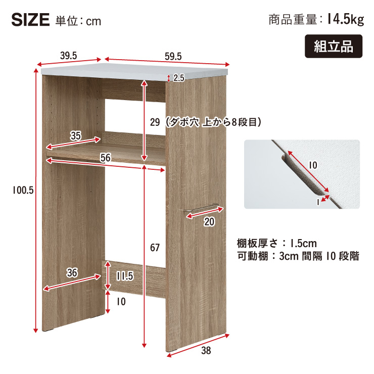 | サイズ | 本体:約W59.5 x D39.5 x H100.5cm(重量:14.5kg) 棚板厚さ:1.5cm 可動棚:3cm間隔10段階 梱包サイズ:104x44x10cm(重量:15kg) |