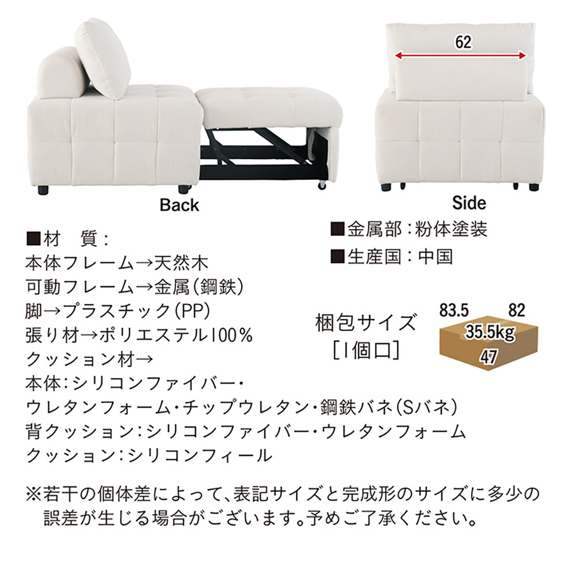 | サイズ | ソファモード:W81 x D81 x H82 x SH45cm ベッドモード:W81 x D147 x H82 x SH45cm |