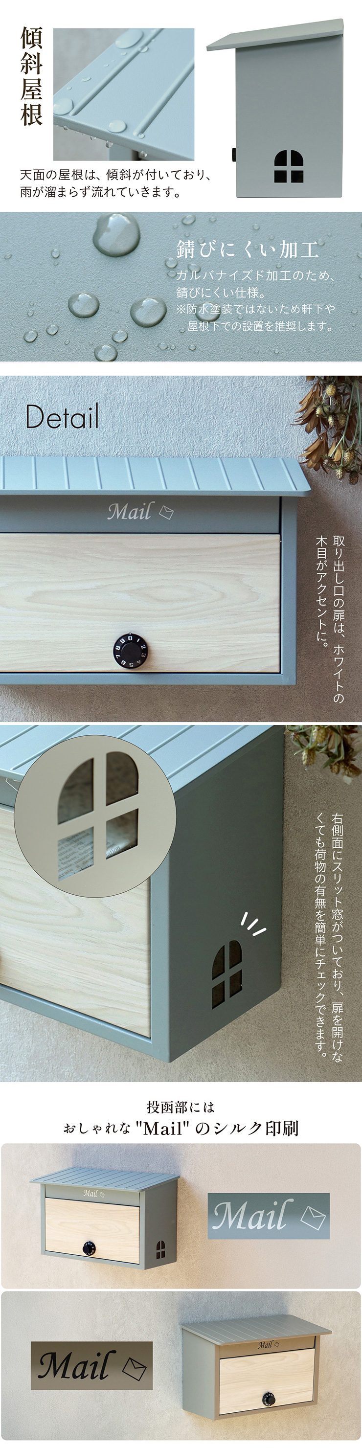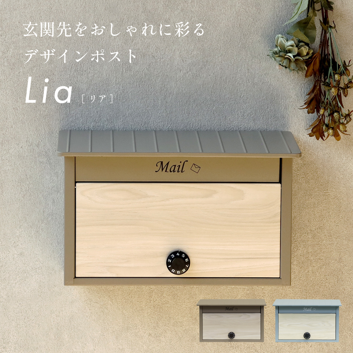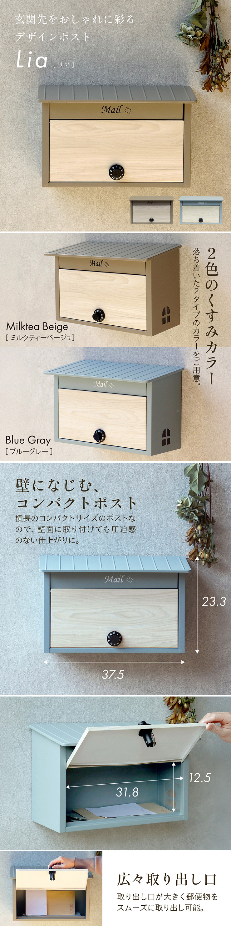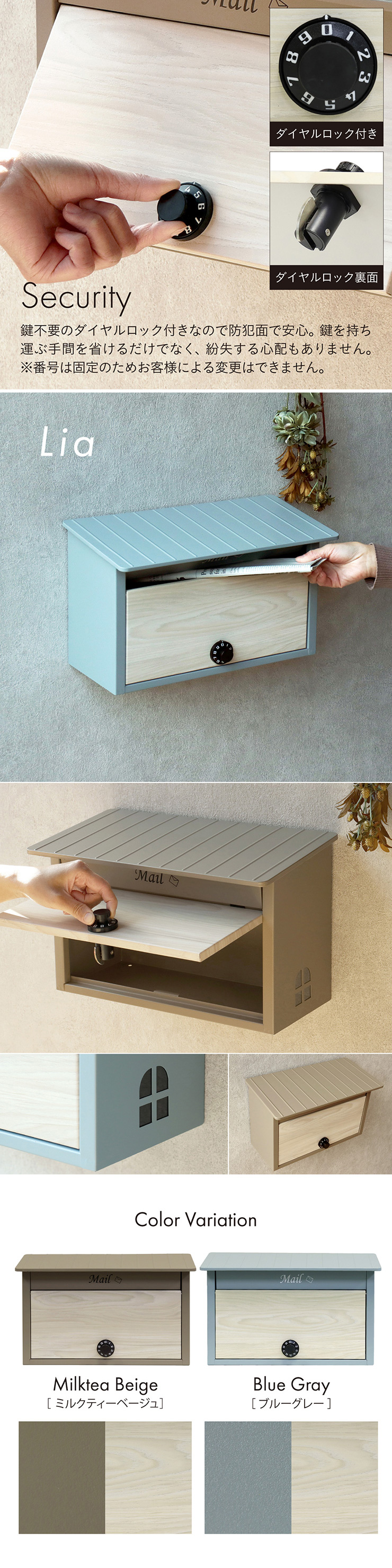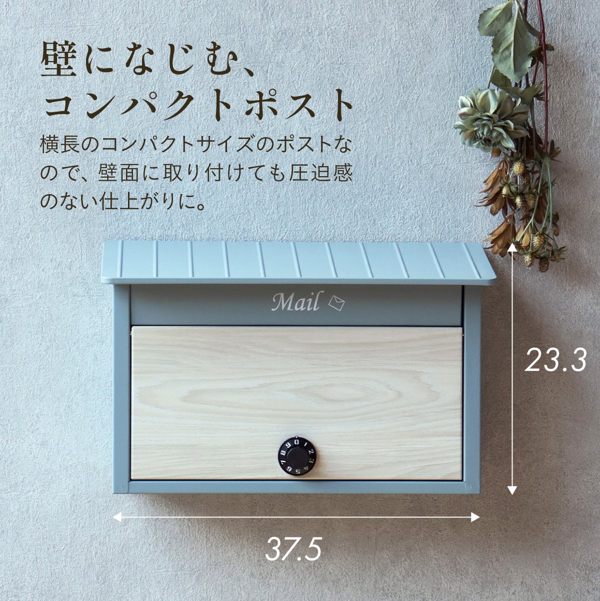 郵便受け 壁掛けポスト Lia(リア) 玄関先をおしゃれに彩るデザインポスト。2色のくすみカラーをご用意しました。 ■横長のコンパクトサイズのポストなので、壁面に取り付けても圧迫感のない仕上がりに。 ■取り出し口が大きく郵便物をスムーズに取り出し可能です。 ■天面の屋根は、傾斜が付いており、雨が溜まらず流れていきます。 ■ガルバナイズド加工のため、サビにくい仕様となっています。 ■右側面にスリット窓がついており、扉を開けなくても荷物の有無を簡単にチェックできます。 ■鍵不要のダイヤルロック付きなので防犯面で安心。鍵を持ち運ぶ手間を省けるだけでなく、紛失する心配もありません。 ※防水塗装は施しておりませんので、軒下や屋根がある場所への設置を水準いたします。 ※ダイヤルロックの番号は固定のためお客様による変更はできません。 ※壁面取付用のアンカー、取付ネジが付属しております。(コンクリート・モルタル用) ※光の当たり具合やモニター環境により実際の商品と色味が異なって見える場合がございます。予めご了承ください。 | |