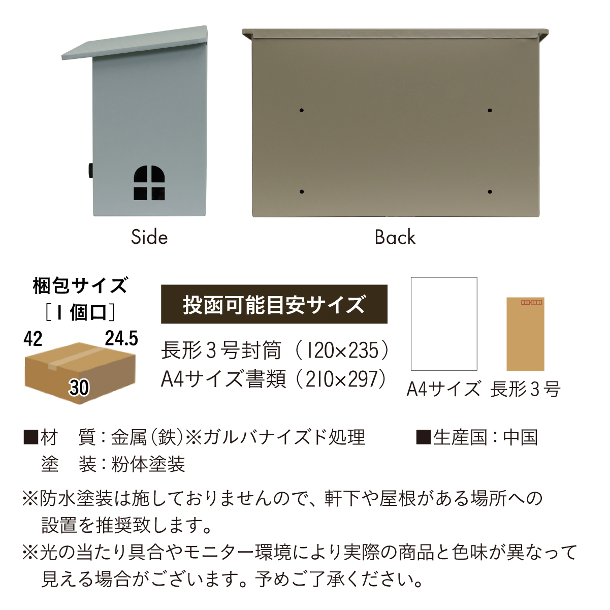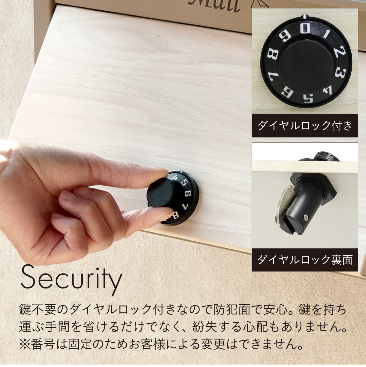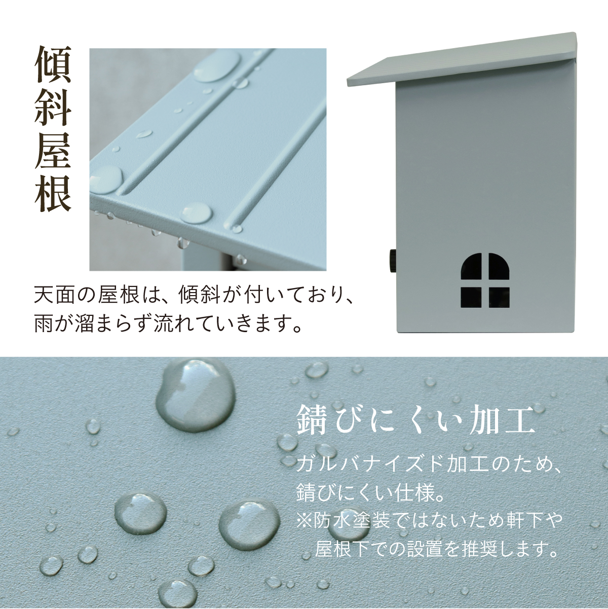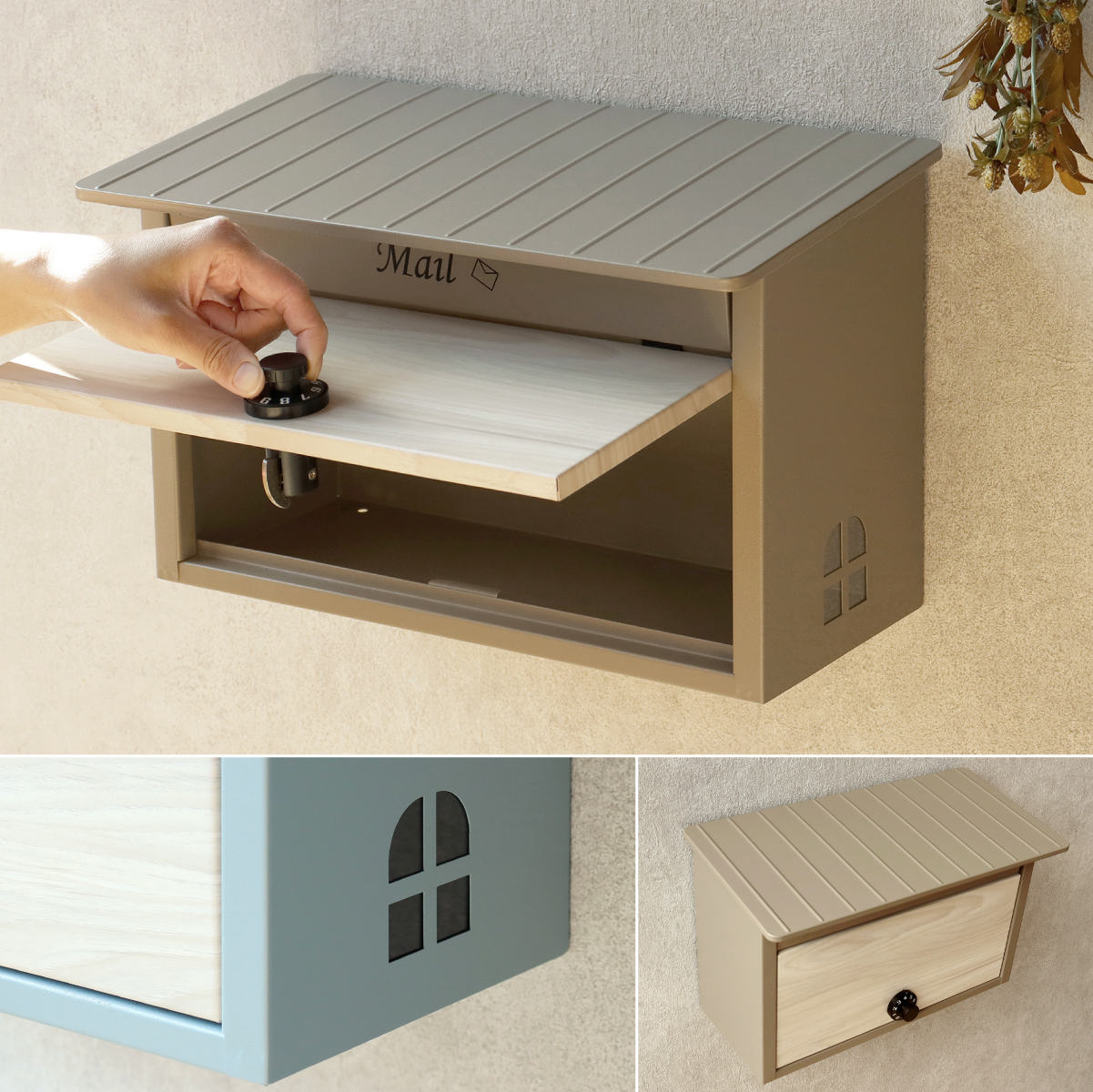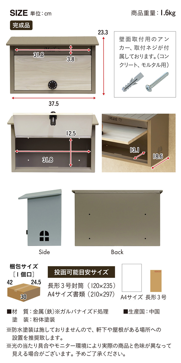 郵便受け 壁掛けポスト Lia(リア) 玄関先をおしゃれに彩るデザインポスト。2色のくすみカラーをご用意しました。 ■横長のコンパクトサイズのポストなので、壁面に取り付けても圧迫感のない仕上がりに。 ■取り出し口が大きく郵便物をスムーズに取り出し可能です。 ■天面の屋根は、傾斜が付いており、雨が溜まらず流れていきます。 ■ガルバナイズド加工のため、サビにくい仕様となっています。 ■右側面にスリット窓がついており、扉を開けなくても荷物の有無を簡単にチェックできます。 ■鍵不要のダイヤルロック付きなので防犯面で安心。鍵を持ち運ぶ手間を省けるだけでなく、紛失する心配もありません。 ※防水塗装は施しておりませんので、軒下や屋根がある場所への設置を水準いたします。 ※ダイヤルロックの番号は固定のためお客様による変更はできません。 ※壁面取付用のアンカー、取付ネジが付属しております。(コンクリート・モルタル用) ※光の当たり具合やモニター環境により実際の商品と色味が異なって見える場合がございます。予めご了承ください。 | |
