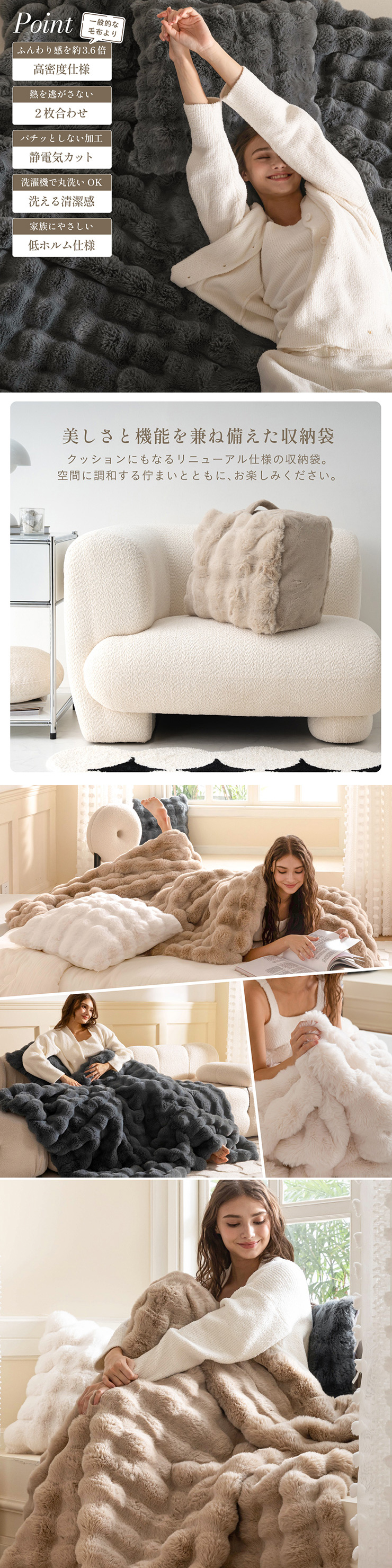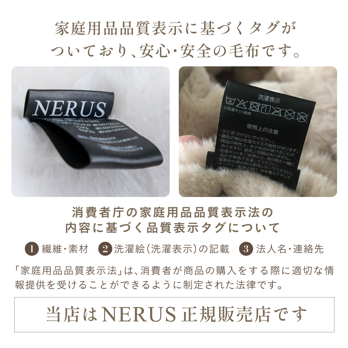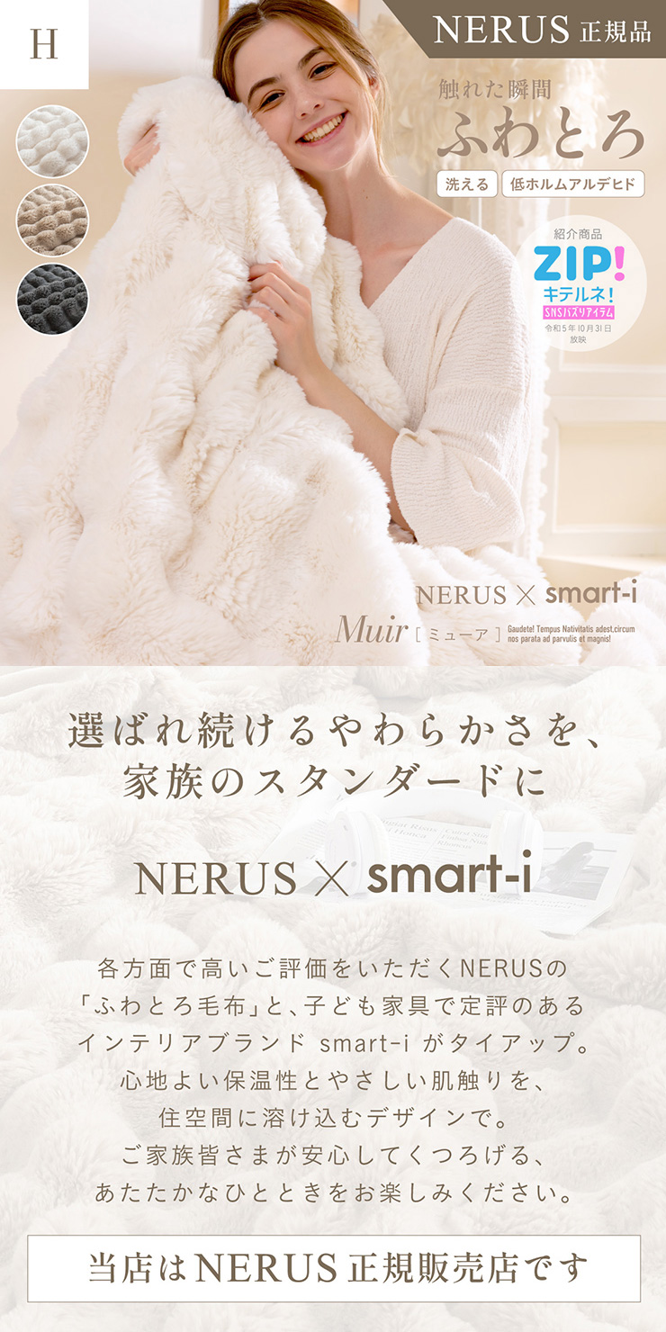 【NERUS×smart-i】触れた瞬間ふわとろ 毛布 Muir(ミューア) 選ばれ続けるやわらかさを、家族のスタンダードに 各方面で高いご評価をいただくNERUSの「ふわとろ毛布」と、 子ども家具で定評のあるインテリアブランド smart-i がタイアップ。 心地よい保温性とやさしい肌触りを、住空間に溶け込むデザインで。 ご家族皆様が安心してくつろげる、あたたかなひとときをお楽しみください。 ■美しさと機能を兼ね揃えた収納袋 クッションにもなるリニューアル仕様の収納袋。 空間に調和する佇まいとともに、お楽しみください。 ■2枚合わせが叶える、上質なあたたかさ ラビットファー調とミンクファー調を組み合わせた二重構造。 空気の層を閉じ込め、優れた保温性と上質なぬくもりを届けます。 ■包み込むとろふわ、3.6倍の高密度フランネル 一般的な180g/mに比べ、当製品は650g/mの重厚な生地。 約3.6倍の密度が空気層を生み、優れた保温性を叶えます。 ■冬のパチッを防ぐ 静電気防止加工済み 乾燥が気になる季節に嬉しい、静電気防止加工済み。 ほこりの引き寄せも軽減してくれます。 ■低ホルム仕様と国際品質基準 肌に優しい低ホルム基準、国際規格ISO9001認証工場で生産。 大切なご家族にも安心してお使いいただけます。 ■家庭用品品質表示に基づくタグがついており、安心・安全の毛布です。 「家庭用品品質表示法」は、消費者が商品の購入をする際に適切な情報提供を受けることができるように制定された法律です。 ■ご自宅でお洗濯可能 ご自宅でのお洗濯が可能で、いつでも清潔さを保てます。 また、ふわふわ感が復活し、心地よくお使いいただけます。 収納袋はシーズンオフの寝具を収納してクッションとして活用できる。 ふわとろ毛布と同じ生地を使用しているので、触り心地も抜群。 取っ手付きで、持ち運びの際にも便利です。 ファスナーが大きく開くので出し入れしやすく、枕や布団など大きめの寝具も収納することができます。 ファスナーが毛羽に埋もれてわかりにくい場合がございます。 ※開封時に毛が出てくる場合がありますが、生産時のカットで付着した浮き毛です。 ※生地の構成上、毛が抜ける事がありますが抜かないでください。 ※アレルギー等が気になる方はご購入をお控えください。 ※直射日光の当たる場所・高温多湿な場所・火気の近くでのご使用・保管は避け、風通しの良い場所でご使用ください。 ※商品の開封直後に、においが気になる場合は風通しの良い日陰でしばらく陰干ししてください。 ※湿ったまま放置するとカビの原因となりますのでご注意ください。 ※商品写真はできる限り実物の色に近づけておりますが、お使いのモニター環境、照明、製造ロット等により実際の商品と若干色味が異なる場合がございますので予めご了承ください。 ※計測方法や製造ロットによりサイズに誤差が生じる場合があります。 ※商品到着後すぐに開封し、商品に不具合等ないかご確認ください。 ※納品書・領収書は同梱いたしません。領収書はご注文履歴より発行をお願い致します。 ※デザイン、仕様、外観、価格は予告なく変更となる場合があります。 | |